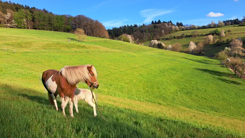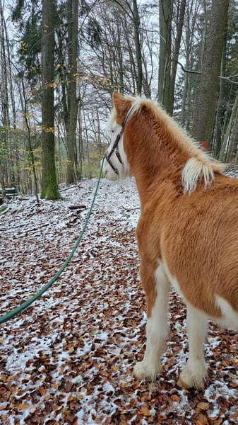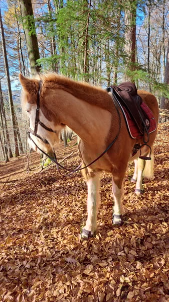 Frökk is a registered and licensed broodmare in Studbook 1, with a chestnut and flaxen mane and tail. She has produced a total of three wonderful foals. Her latest foal, born in April 2025, is a stylish grey filly with a flaxen mane and tail, sired by Creme. She was born on May 30, 2018, and was gently backed at the beginning of 2025. She is very well-behaved alone in the terrain and is also quite fearless. Hikers, dogs, flutter tapes, or forest machinery are no problem for her. Currently, she is ridden bitless with a sidepull and goes very softly. I have recently started introducing her to the bit, but it’s very unobtrusive. She shows great willingness to work in groundwork exercises. She is familiar with lunging, equicinetics, pole work, and free jumping. In-hand, she knows shoulder-in, leg-yield, and overbending circles. She also performs very well with leg-yielding on a turn, which I often use for mounting. She can also do a few tricks. As a lead horse, she works very reliably. She has a pleasant, lively walk and a beautiful, expressive trot with lots of action. The tölt is easily accessible under saddle, although she generally needs more conditioning and strength in this gait. She is kept in an open stable with me and is very social and compatible. In winter, she receives unlimited hay, and in summer, she is on pasture 24/7. Her vaccinations, deworming, and hoof care are up to date. She is barefoot and moves very well without shoes here. PSSM/MIM negative. Her teeth have just been recently floated. Most of her training with me is ground work, as I feel I am too large and heavy for her to carry comfortably under saddle. I am looking for a nice home where she can be the center of attention and perhaps be trained in a versatile way. She is very communicative with me and always greets warmly. Frökk is a very sweet, sensitive mare, but still a young horse. You should be familiar with fine aids, as I train my horses very subtly and quietly. If you are interested, please feel free to contact me, also via WhatsApp at 015757999782.