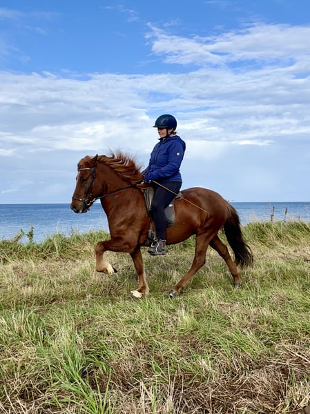 Rúbín ist ein fünfgängig veranlagter Wallach, der viergängig geritten wird. Er ist traumhaft zu reiten, weil er zum einen unbeschreiblich leichtrittig (am kleinen Finger zu reiten) ist und zum anderen so freundlich und lieb ist, dass es eine Freude ist, mit ihm zu arbeiten und ihn reiten zu dürfen. Ein richtiges Luxusreitpferd! Rúbín hat sehr gleichmäßige und dabei schicke Gänge, die alle ganz leicht zu reiten und sicher abrufbar sind. Sein Tölt ist ein Traum und sein Galopp weich und schön gesprungen. Schritt und Trab sind ausdrucksvoll und sicher. Es gibt nichts, was man mit Rúbín nicht machen kann. Durch seinen sehr guten Ausbildungsstand und seine Leichtrittigkeit lässt er sich herrlich dressurmäßig arbeiten oder auf der Ovalbahn in den schicken Gangarten trainieren. Aber am allertollsten ist mit ihm das Reiten im Gelände! Rúbín ist absolut sicher allein aber auch in kleinen und großen Gruppen auszureiten, dabei immer regulierbar und trotzdem fröhlich sprudelnd, auch Straßenverkehr macht ihm nichts aus, er ist einfach eine sichere Bank. Er hat ein mittleres Temperament und macht immer so viel, wie sein Reiter es verlangt. Rúbín ist für viele unterschiedliche Reiter passend: ein ambitionierter Reiter gleich welchen Alters hätte einen wunderbare Partner an seiner Seite, sei es für stressfreies und sicheres Ausreiten, Reitunterricht und Kurse bis hin zu Abzeichen- und Trainerprüfungen oder auch als Partner im Sport. Auch ein Kind mit etwas Reiterfahrung käme mit ihm zurecht. Weil er so gut ausgebildet und fein zu reiten ist, wünschen wir uns für ihn keinen absoluten Anfänger als Reiter. Er wird wegen Studiums von privat im Auftrag verkauft.