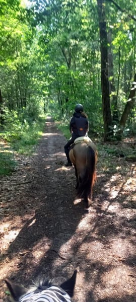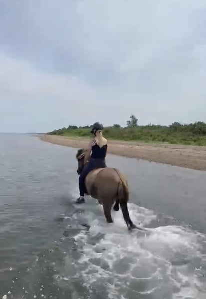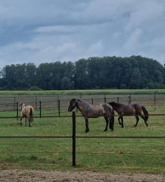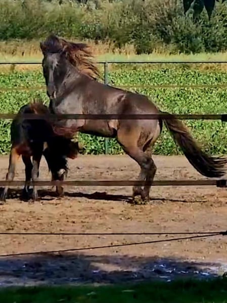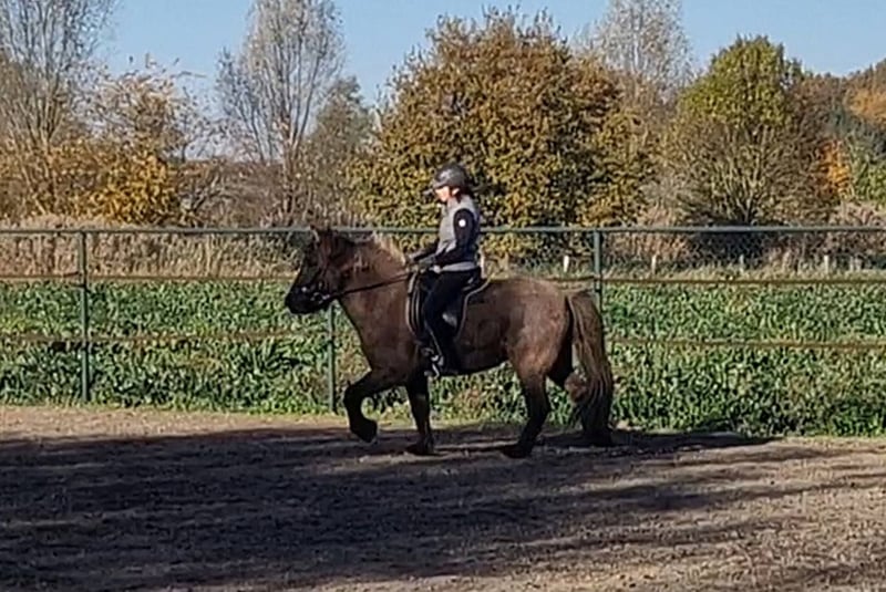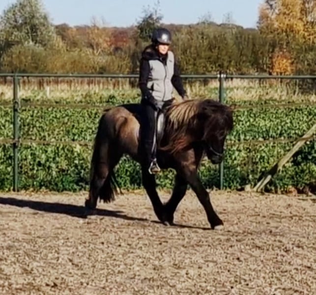 Schicker Mausfalbe, 6 J. Wallach, von 1st. Preis Eltern(Draumur fra Gulbaek x Nunna fra Gulbaek). Anfang 2025 professionell auf Bahn angeritten in DK (Trainer Kronholt) einige Monate und dort auch abwechselend mal im Gelände geritten, bietet er immer taktklarer Tölt an. Wird jetz hier auch auf dem Reitplatz brav schonend im Schritt, Trab und Tölt geritten. Auf dem Reitplatz geritten wünschen wir uns für ihm jemanden der weiss was geraderichten ist, dann ist er auf zwei Finger losgelassen zu reiten. Auf dem Reitplazt ist der Galop noch zu gelaufen und wird dort noch nicht trainiert. Der Galop ist aber im Gelände aber schon sehr schön und einfach zu reiten, auch bequem in mehrere Tempo. Bietet im Gelände immer sofort taktklar tölt an, auch mit losen Zügel.. Hatt dort etwas mehr vorwärtsdrang und ist aufmerksam. Auch wenn noch wenig Erfahrung, macht er aber kein blödsinn wie bocken, durchgehen oder steigen. Wir sind hier schon einiges auf die Straße begegnet, da hier schon Monate viel arbeiten mit große Maschinen und Lärm sind, was er allem ohne Problem gemeistert hatt. Kennt (Groß)verkehr von Lohnarbeiter hier, Fahrräder, Hunde u.s.w. Ein Pferd, gerne auch für jemanden der auch im Gelände unterwegs sein möchte....geht einfach alleine vom Haus weg. Kann mit andere Pferde an jeder Stelle im Gelände geritten werden, lauft aber auch gerne vorne. Wieder wegreiten von andere Pferden ohne Probleme. Verträglich in der Herde, spielt gerne mit unser Jährling, und ist weiterhin sehr lieb und ruhig im Umgang, Schmied, putzen, satteln usw. Wird hier in Offenstalhaltung gehalten, offfener Stall mit Wiese und Paddock. Er läuft seit ein halbes Jahr barhuf, das klappt wunderbar auf jeden Boden, die Bewegung ist aber ohne Eisen auch flacher jetz. Der Tölt ist super angenehm und bequem, wie auch Galop. Trabt sehr schön und wechselt einfach die Gänge. Supernettes junges Pferd was auch von unerfahrene Reiter brav geritten werden kann auf dem Platz und Gelände, aber gut auf leichte Hilfen reagiert und am schönsten zu reiten ist von schon etwas erfahrene Reiter mit sanfte Hand und deswegen haben wir entschlossen ihm nicht zu verkaufen an Anfänger, Wiedereinsteiger, Angsthasen oder für Familien mit Kinder. Kein Ekzem, keine Allergie oder sontiges. Er hatte beim Ankauf in 2025 vor dem Import aus DK eine ausführliche AKU inkl. 22 Röntgen Beine und ist damit in die Krankenversicherung aufgenommen, welche bei Bedarf übernommen werden könnte. Ein neue AKU darf natürlich durchgeführt werden von einem TA, der sich mit Gangpferde auskennt. Spricht dir dieses nettes und liebes Pferd an, das ich leider schweren Herzens aus eigene zunehmende gesündliche Probleme verkaufe da ich zu wenig reiten kann, dann schreib uns gerne an mit einiges an Info. Wir können dan gerne telefonieren und dir dann mehrere Videos senden, so wohl vom Platz als Gelände. Zubehör kann mit verkauft werden.