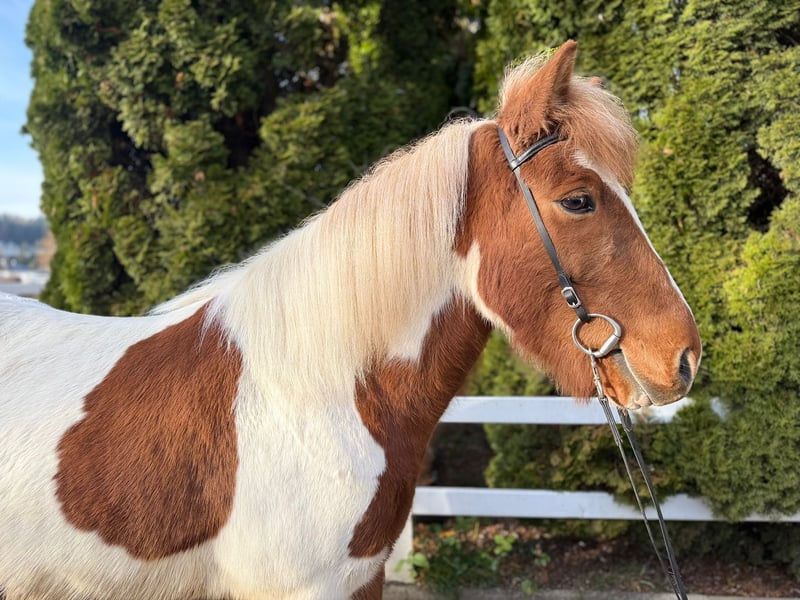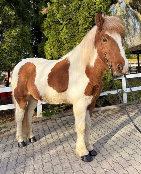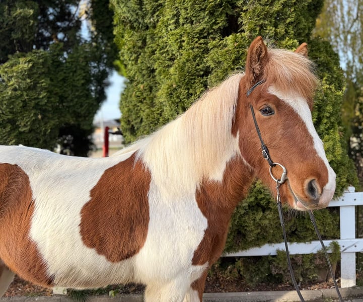 Gígjar frá Flögu Wallach, 144 cm *2018 in Island Viergänger Fuchsschecke Beschlagen, geimpft und entwurmt V: Mugison frá Hæli 8,55 (Ext 8,46 Re 8,61)‼️ VV: Spuni frá Vesturkoti 8,92 (Ext 8,43 Re 9,25)‼️ M: Gæfa frá Flögu 7,88 (Ext 7,52 Re 8,12) MV: Kolfinnur frá Kjarnholtum II 8,45 (Ext 8,05 Re 8,84) ‼️ Der schöne Gigjar gehört mit 144m Stockmaß und seinem stabilen Gebäude zu den größeren seiner Rasse und dann noch kombiniert mit einer bombastischen Abstammung überzeugt er als Gesamtpaket. Sein Vater hoch geprüft und sein Opa „Spuni frá Vesturkoti“ wohl jedem ein Begriff, der sich etwas mit der Zucht beschäftigt. Sowie auch der Opa mütterlicherseits ist hoch geprüft und lässt Züchterherzen höher schlagen. Dank seiner Vorfahren hat er ganz klar getrennten vier Gänge von sehr guter Qualität, die stets einfach zu reiten sind und mit sehr ansprechender Bewegung überzeugen. Mit einem ambitionierten Reiter kann Gigjar definitiv im Sport Viergang und Tölt punkten. Sein Temperament ist perfekt: nicht zu flott, nicht so langsam, nicht zu stumpf und auch nicht zu sensibel. Aufgrund seines freundlichen und höflichen Wesen eignet er sich auch perfekt als Luxusfreizeitpferd. Gígjar ist stets motiviert und freudig bei der Arbeit, sei es auf der Bahn, im Viereck, in der Halle oder im Gelände. Er steht aktuell bei uns in einer Paddokbox mit einem Kumpel gemeinsam und zeigt sich dabei total unkompliziert. Auch in der Herde fühlt er sich pudelwohl. Preisrahmen 15.000€ - 17.000€ Wer also einen super lieben Allrounder in Sonderlackierung kennenlernen und probieren möchte kann dies gerne nach Absprache in A-5221 Lochen am See tun.