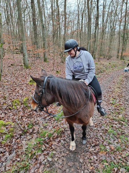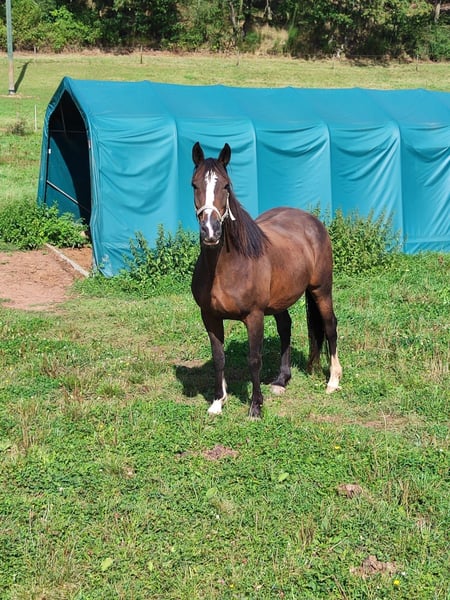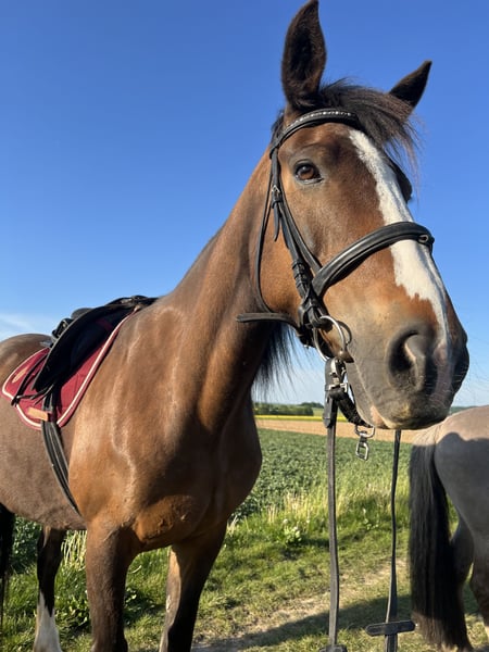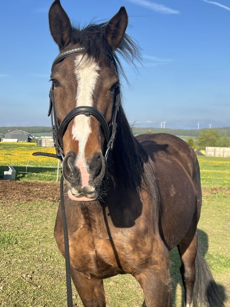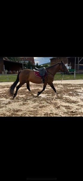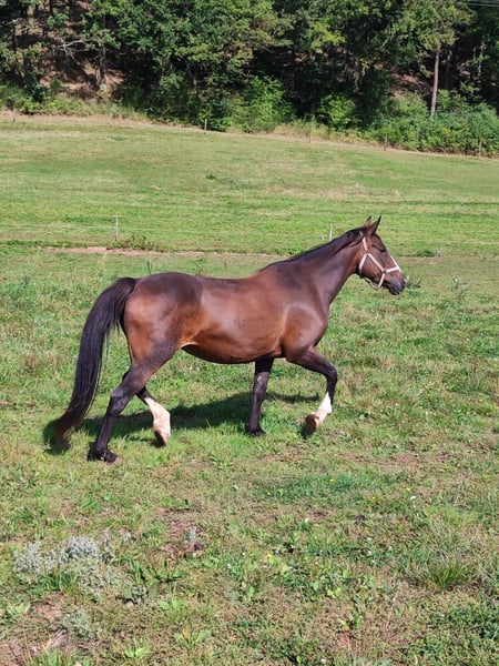 Offered here is a mare, born in 2012, bay, standing at 160 cm, healthy for sale. She is very people-oriented and loves to cuddle. She enjoys groundwork and is always attentive, with very nice, expressive gaits. The mare is very well-behaved in handling, loads well onto a trailer, is easy to groom, saddle, and can be taken away alone; the farrier is no problem at all. On the lunge, she performs all three gaits flawlessly, is very sensitive, and responds well to voice commands. She shows jumping ambitions, enjoys groundwork and gymnastic exercises, and needs further development as she has a lot of potential and wants to please! Unfortunately, she seems to have had very bad experiences during her initial training and can only be ridden by experienced, confident riders. (Then she can be ridden well.) She is initially anxious when mounting. She has already been in training twice. Unfortunately, I do not have the necessary time to do justice to her training. Therefore, I am looking for an experienced rider who can invest time in her training. She has also had a foal before, making her interesting as a breeding mare (white papers). She needs a place where she can continue to be developed. She will not be sold to beginners or re-riders. For more details, pictures, videos, etc., feel free to contact me via private message or arrange a meeting.