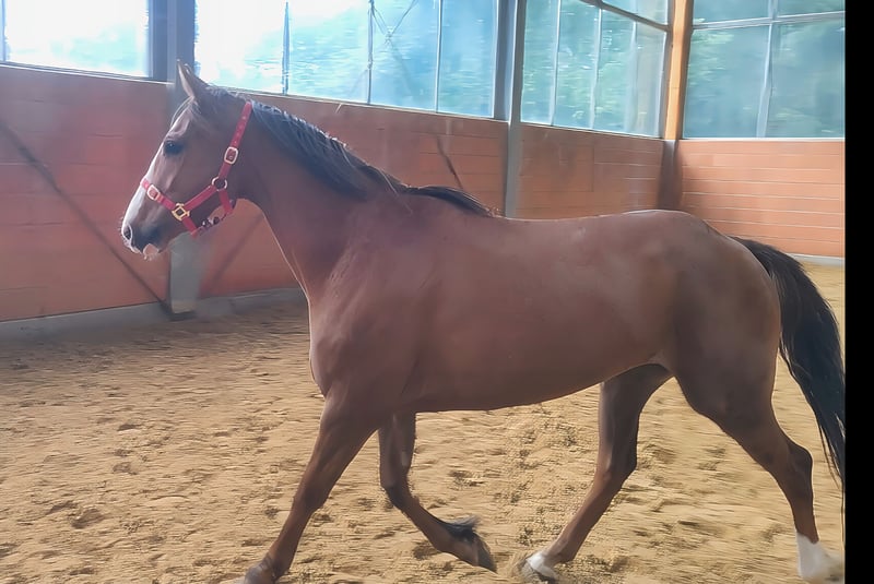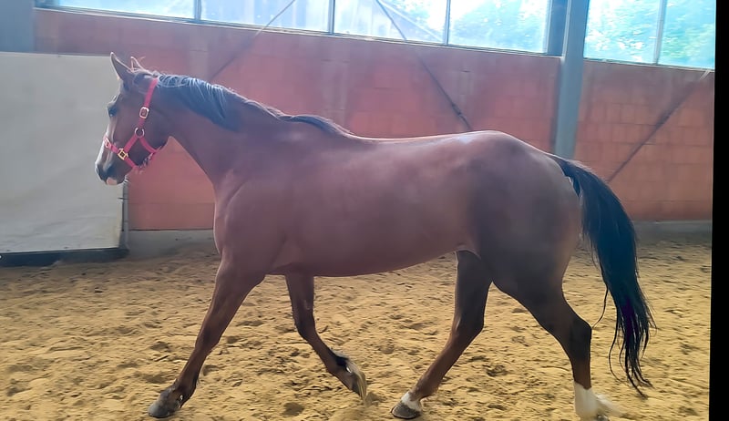 Cavalla di 3 anni, compatta, alta circa 162 cm, con potenziale meritevole di sviluppo. Di carattere stabile, ora può iniziare un'istruzione solida. Il trasporto può essere organizzato. È possibile effettuare un'ispezione veterinaria pre-acquisto anche tramite il proprio veterinario, inclusi raggi X e analisi del sangue. Si prega di contattare esclusivamente telefonicamente al numero 01774289729.