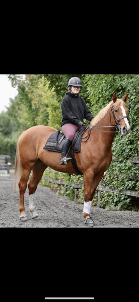 BANAGHER PIXIE 6-jährige Flaxen-Rotschimmel-Stute Gemessen mit SJI bei 1,58 m Von Coolfin Dynamite aus einer Grade-A-Stute, die von Coranado abstammt Pixie wurde in den letzten drei Jahren langsam von einer kleinen Dame ausgebildet. Sie reitet außergewöhnlich gut im Dressurviereck. Hat bis 1,10 m gesprungen. Hat das Potenzial, die höheren Klassen zu erreichen, wendet blitzschnell und hat einen tollen Galopp. Mehrfach im Gelände ausgebildet und geritten. Leicht, aber erfolgreich im kleinen Hunter und Intermediate Show Hunter gezeigt, mit zahlreichen Platzierungen und Siegen. Teilgenommen am Dublin Horse Show 2025. Vollkommen unkompliziert in allen Belangen und bei den Stallkollegen sehr beliebt. Allein und in der Gruppe problemlos ausgeritten. Oft wurde sie hier genutzt, um die jungen Pferde bei ihren ersten Ausritten anzuführen. Kann wochenlang abgestellt werden und man kann sofort wieder aufsteigen, ohne Unsinn. Sie hat eine ausgezeichnete Konformation, ist gerade und korrekt gebaut. Drei ausgeglichene Gänge, super Bewegungsqualität. Sie hat keine Macken oder Unsportlichkeiten. Röntgenbilder ab März 2025 verfügbar. Leider hat Pixie seitdem eine kleine Spat auf ihrem vorderen rechten Bein entwickelt, die jedoch unbedeutend ist. Dies ist ein schwerwiegender Abschied von einem sehr geliebten Pferd, das nur in eine Top-Unterkunft abgegeben wird. Der Besitzer möchte sich auf das Showen konzentrieren, da diese Stute noch viel Potenzial hat. Sie wäre eine ernsthafte Kandidatin für junge Reiter im nächsten Jahr oder auch ein großer Spaß für einen engagierten Amateur. Derzeit ist sie beim SJI registriert und wird bis zum Verkauf weiterhin mit einem jungen Reiter springen. Bitte keine Anfänger oder ängstliche Reiter – diese hochwertige Stute hat viel Power und viel zu geben für die richtige Person. Videos und Bilder auf Anfrage verfügbar.