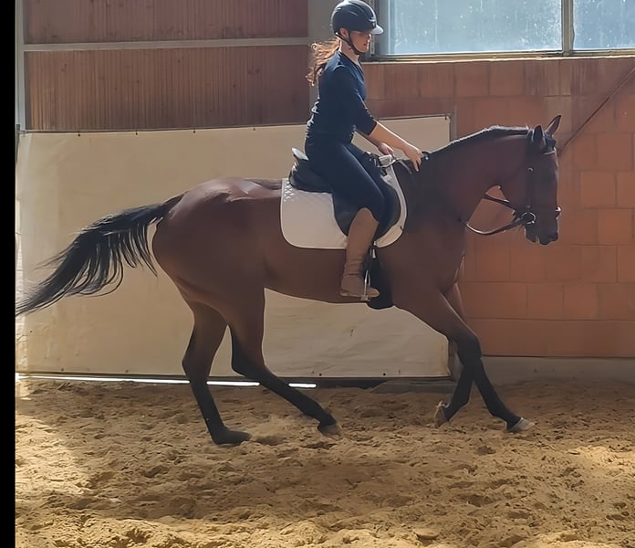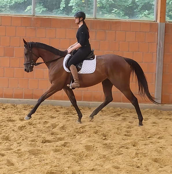 Charming, friendly 5-year-old mare, approximately 165 cm tall, with a great character and, as can be seen from the pictures, equipped with expansive, stylish movement. A mare that you immediately fall in love with and who is always eager to give her best. With her open, radiant personality, she knows how to impress right away. She adapts well to her rider and forgives minor rider mistakes. She is familiar with the arena, outdoor arena, and trails. She is compatible with other animals (horses, dogs, etc.). We can also well imagine her being used in a reasonable riding school operation. If needed, she can be sold with complete new equipment for a small additional fee. Trade-ins and transport are possible. A veterinary purchase examination can also be conducted by your own veterinarian, including X-rays and blood tests. We look forward to your call at 015172059610. Written inquiries will not be answered. Calls with suppressed numbers will be automatically rejected.