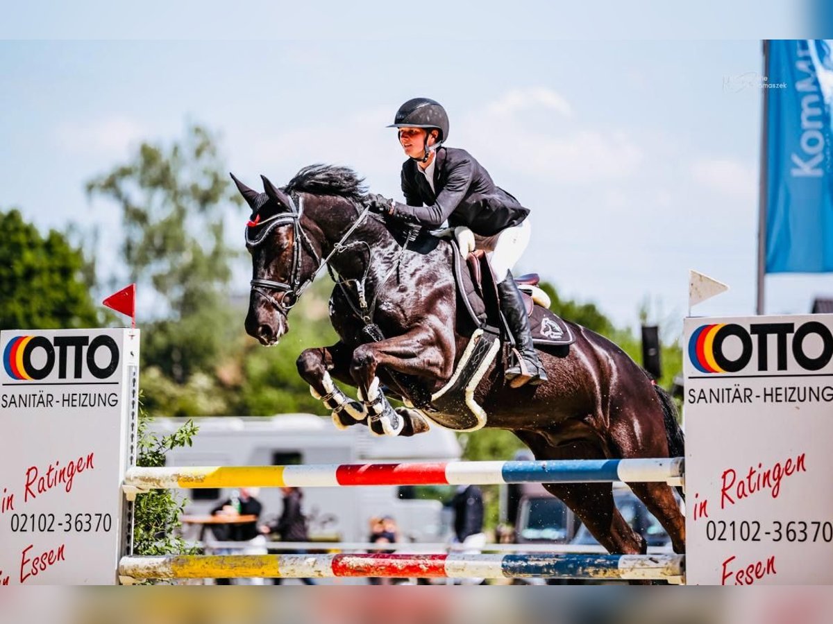 This gelding immediately captures attention: tall-legged, modern, with a powerful conformation and a movement system that leaves nothing to be desired. A wiry sport horse that combines rhythm, flexibility, and scope at the jump in a rare form. Successfully competing up to 1.30 m show jumping and ready for international competitions and larger challenges. His brother already competes successfully at 1.45 m in America.