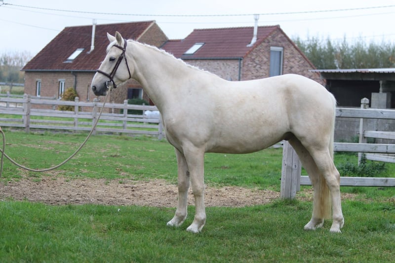 ✨ Unique color, unique size! 🐴 Breed: Irish Sport Horse 📏 Height: 16.1 hh 📅 Age: 4 years 💪 Build: very broad and sturdy - Well-behaved under saddle but still green in training. - Walk and trot are well-established; he moves nicely relaxed at the lower gaits. - Canter needs a bit more stability. - Extremely gentle in handling — a real cuddly teddy bear 🥰 (would crawl into your pocket!). - Gets along well with other horses both in the arena and in the pasture. This handsome gelding, due to his age and build, is not suitable for a beginner rider but has enormous potential for someone with some experience. Ideal for someone looking for an eye-catcher that is still fully customizable! 📞 More info: +32 475 68 22 43 🎥 For videos: ask for our website.