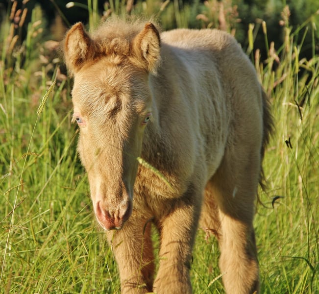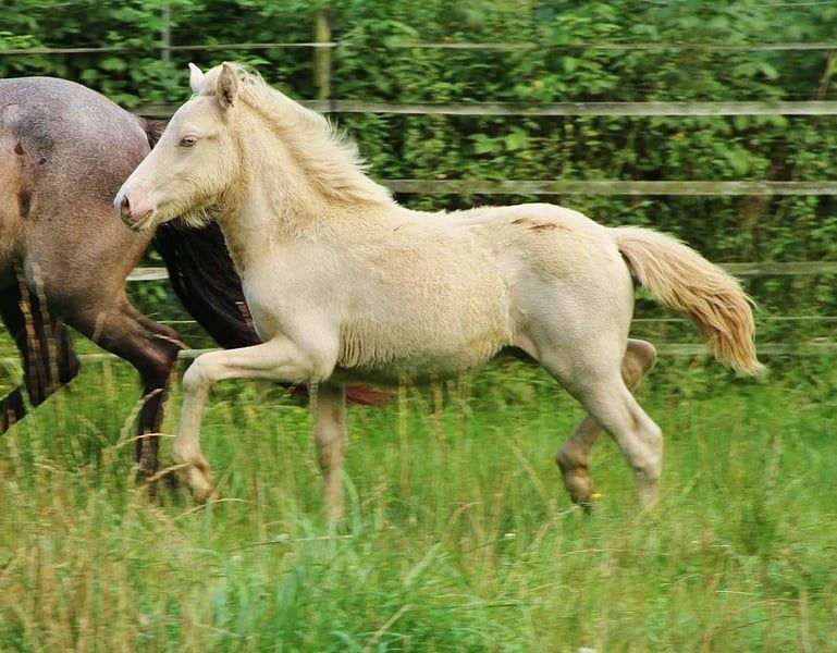 Fagurfifill is currently a unique name given only once, and it perfectly suits this extraordinary horse. Born with a striking white coat and blue eyes, he was tested as a Perlino due to his purebred heritage on the Cremello gene. Additionally, he has inherited the grey gene from his sire, making him a double-cream grey. The grey gene does not alter his color further, as he is already white through double cream. In breeding, Fagurfifill could produce offspring with liver chestnut, Smokey Black, or Isabelline coats, with a 50% chance of passing on the grey gene. His excellent pedigree, combined with his character and movement, makes him interesting for all disciplines. His lineage includes highly tested horses such as Þórálfur frá Prestsbæ, son of Álfur frá Selfossi; Þorlákur frá Prestsbæ, son of Krákur frá Blesastöðum 1A; and Skjanni frá Nyjabae, son of Hróður frá Refsstöðum. Also among his ancestors is the well-known Klettur frá Hvammi. His pedigree is fully DNA-confirmed up to his great-grandparents; beyond that, there are some gaps where DNA data is missing for certain horses. Character-wise, he is an absolute treasure—trusting and friendly from birth, with an innate confidence. He approaches most situations calmly and has already experienced many environmental factors through his previous handling. His temperament is very balanced, with a clear head, good movement, and a cooperative nature. He is familiar with basic foal training, including hoof care, and has been easy to handle in this regard. He is accustomed to being loaded into a trailer and transported to pasture, making him confident with loading. Since birth, Fagurfifill has been healthy, uninjured, eczema-free, regularly dewormed, and vaccinated against tetanus and influenza. He is used to daily supplementary feed with Lexa Juniormineral. At 1.5 years old, he has a good size, with an expected final height of around 14.0 hh. From the start, he has had a solid build, long legs, and a well-proportioned neck and back. Considering his parents, he should develop into a stable, athletic horse with a balanced conformation. Currently in a growth phase, it’s normal that he may not yet appear perfectly proportional or refined, as is typical for many young horses. He inherited a magnificent, long mane from his mother, which is now even longer than in the autumn photos taken in the flower field. Fagurfifill is five-gaited with strong basic gaits. His walk is well-developed, and in the first weeks after birth, he primarily showed tölt and occasionally pace. Since discovering the trot, he performs it confidently, with a ground-covering stride, lots of push, and good speed capacity. Depending on his mood, tölt is visible in transitions and more. His canter is well-developed for a five-gaited horse, often with a tendency to uphill movement. He shows great potential in all gaits and will not only be an excellent leisure horse but also suitable for sport and breeding. Upon request and at cost, he can be gelded and, after healing, rehomed. Both testicles are descended and present. Currently, he is quite fluffy and can be personally visited for a closer look. The photos are from foal stage until early winter 2025. There is only a foal video available at the moment; additional videos are not feasible at this time due to organizational and space limitations. If genuinely interested, I look forward to your message. Payment in installments is possible as long as he remains in my care; additional costs for care must be covered during this period. A veterinary check (AKU) can be arranged by your preferred veterinarian.