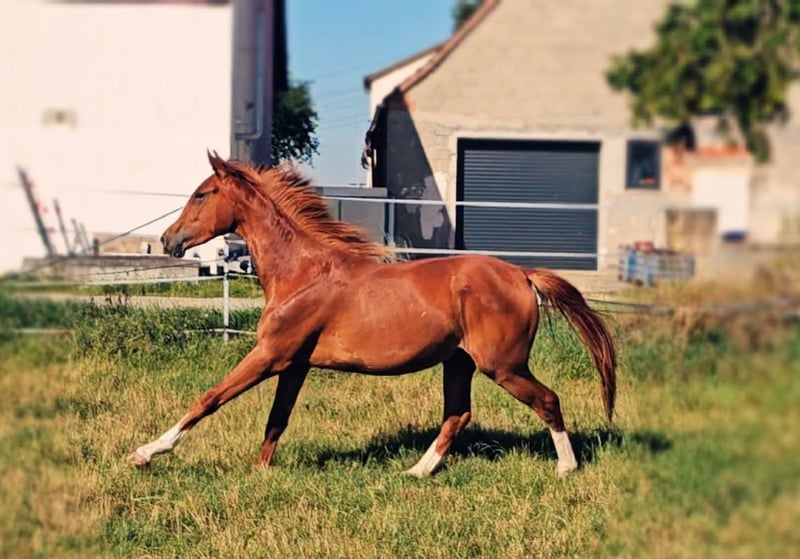 We are looking for a new home for a very special, two-year-old, untrained mare with the potential for ambitious, athletic development for big tasks and higher demands! - **Breed:** Hanoverian - **Gender:** Mare - **Year of Birth:** 2023 - **Color:** Colorful chestnut - **Height:** 172 cm - **Suitability:** Eventing, Dressage, Show Jumping - **Training Level:** Untrained This talented, energetic young mare impresses not only with her attractive appearance, her distinctive head, and her enormous power but also with her unique character and strong will. She is ideally suited for eventing and already shows promising approaches in both dressage and show jumping. Like one would expect from a young and blooded horse, she has a lot of go and an iron will. She is not easily manipulated and enjoys challenging her human. She likes to test whether our will is at least as strong as her own and whether it is worth it for her to commit to her human. Like a wild child. However, once you have convinced her, she will be on your side forever. She does not follow just anyone and certainly not under pressure. One must be smarter than she is and know exactly what they are doing and wanting. The person whom this strong-willed mare follows should consider themselves lucky to have a true warrior by their side, one who would go to great lengths for their human if necessary... The mare is well-socialized, lives in a mixed-age herd of mares, and is therefore accustomed to interacting with other horses. She is dominant, rather high-ranking, but knows how to subordinate herself as well. She is not a bully but does not allow herself to be pushed around either. She does not provoke conflict but does not shy away from it either. She has incredible endurance and is ready to grow together with her new, own human. She will become a true, demanding sport horse, so we do not see her as suitable for weak or inexperienced riders. She has enormous strength and more than enough frame and caliber, making her also well-suited as a horse for men. If you are interested or would like more information, we look forward to your message.