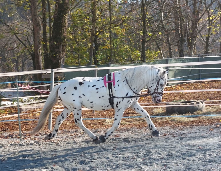 VIRGIL AF DUTTERUP KnabstrupperPony, geb.08.04.09, Braun-Tigerschecke, 139cm V: Timon af Lille Hav MV: Sokrates af Mesballe - Natursprung an der Hand - Standort/Deckstation: 'WüPie's Pferdezucht' 95119 Naila OT Culmitz - Paddockbox für Gaststute (mit/ohne Fohlen) vorhanden (Preis siehe Deckvertrag/Deckbedingungen auf Anfrage) Gekört in Dänemark beim KNN, Leistungshengst - HLP 2Tages Kurzprfg.in Ansbach 2014 mit ges.7,53 Schritt&Trab je 7,0 / Galopp&Rittigkeit je 7,5 / Springveranlagung 8,0 Er wird beim ZfdP (Zuchtverband für deutsche Pferde) im Hengstbuch HB I geführt, außerdem ist er im Pferdezuchtverband Sachsen-Thüringen und beim Bayerischen Zuchtverband für Kleinpferde und Spezialpferderassen eingetragen. - Auf der Internationalen Ponyschau vom Ponyzuchtverband Niederbayern/Oberpfalz wurde er im August 2024 Klassen und Rassesieger und am Ende des Tages Gesamtreservesieger der Schau! - Im September 2024 wurde er auf der ZfdP Jubiläumsschau in Baden-Württemberg als sehr ansprechender, korrekter und bewegungsstarker Vertreter seiner Spezialpferderasse ausgezeichnet. - Im März 2025 gewann er gegen Sportponys überragend mit den Wertnoten 8,6 und 8,5 den ZfdP Freilauf & Freispringcup in Niedersachsen. - Im Mai 2025 platzierte er sich in Schleswig-Holstein wiederum gegen Sportponys im Freilauf auf den 4.Rang und im Freispringen auf Rang 2, wieder mit 8er Wertnoten. - Im August 2025 konnte er auf der Internationalen Ponyschau erneut den Klassensieg für sich entscheiden. - sein erster Fohlenjahrgang 2025 (er war die letzten 10 Jahre beim Vorbesitzer leider nicht im Deckeinsatz oder wurde weiter gefördert) lässt keine Wünsche offen und brachte Prämienfohlen hervor! 'Virgil' besticht mit seiner auffallenden Optik in Rasse typischer Tigerscheckung und einem starken Fundament. Sein Schritt ist stets fleißig mit genügend Raumgriff, sein Trab mit leichter Knieaktion und die Galoppade ist immer energisch, dynamisch durchgesprungen. Am Sprung im Freispringen behält er die Übersicht, überzeugt mit einem enormem Springvermögen und ist immer fleißig mit Freude bei der Arbeit. Sein ausgeglichenes Temperament, seine Freundlichkeit und ein klarer Kopf machen ihn zum zuverlässigen, coolen und charmanten Partner im Alltag. Er ist sehr Menschen bezogen, achtet vorsichtig auf Kinder, möchte immer gefallen und sein ausgezeichneter Charakter macht ihn im Umgang unkompliziert und liebenswert. Der Vater 'Timon af Lille Hav' ist ein reinrassiger Knabstrupper vom klassischen Typ mit überdurchschnittlich guten Bewegungen. Er wurde 2013 in Dänemark zum besten Knabstrupperhengst ausgezeichnet. 'Virgil af Dutterup' steht interessierten Züchtern (der o.g Verbände) im Natursprung ab dieser Saison bei uns 'WüPie's Pferdezucht' zur Verfügung. Bei weiteren Fragen,Interesse oder einer Buchung stehen wir Ihnen jederzeit gerne zur Verfügung. Am besten kontaktieren Sie uns per WhatsApp unter 0176/21174148.