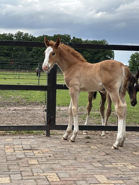 Bent u op zoek naar een veulen met uitstraling, kwaliteit en karakter? ⚜️ Viper de Elegante CH ⚜️ Buitengewoon mooie en veelbelovend hengstveulen, voortgekomen uit een unieke kruising tussen het temperamentvolle Spaanse bloed van de PRE en de moderne elegantie van het KWPN. Hij is niet alleen een echte blikvanger o.a. met zijn ogen, maar beschikt ook over alles wat men zich wenst voor een succesvolle toekomst in de sport én als betrouwbare partner. KWPN-hengstveulen, geboren op 05-05-2025 uit Elegante de Millan III x Obelisk x Jeraldo x Burggraf Verwachte eindmaat: + 1,70 m Onze veulens staan – wanneer het weer het toelaat – vanaf de geboorte 24/7 buiten. Talrijke studies tonen aan dat dit de basis vormt voor een bijzonder sterk paard. Daardoor zijn ze later minder blessuregevoelig en ontwikkelen pezen en botten een extra sterke weerstand. Ze groeien op als familie – merries, hengstveulens en merrieveulens samen – wat hun sociale ontwikkeling enorm bevordert. Iets wat veel veulens in hun eerste levensmaanden missen. Ook later in de opfok leven ze in een gemengde kudde met paarden van alle leeftijden. Dit zorgt voor een goede opvoeding binnen een duidelijke hiërarchie. Zo krijgen onze veulens een sterke basis en de best mogelijke start in het leven. Daar profiteren ze hun hele leven van – en ook voor de toekomstige eigenaar is het een groot pluspunt om een paard te hebben met zo’n gezonde en stabiele basis. Onze veulens worden al kort na de geboorte gewend aan alles: tractor, bladblazer, paraplu, bosmaaier – alles wat in het dagelijks leven lawaai maakt. Met een ontspannen moeder aan hun zijde beschouwen ze dit als volkomen normaal. Voetjes geven, vaststaan, geborsteld worden en overal aangeraakt worden – dat hoort er vanaf het begin bij. Ook hoefsmid, chippen en ontwormen verlopen volledig probleemloos.