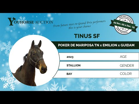 De tweejarige Tinus SF is heel lichtvoetig in beweging en wil geen foutje maken bij het springen. Vader Poker de Mariposa heeft met Willem Greve zijn 1.50m debuut gemaakt op 5 mei in Mannheim. Als zoon van Nabab de Reve uit de 1.60m Grand Prix-merrie Ilena de Mariposa (Berlin) is hij zeer interessant gefokt. Grootmoeder is de topspringmerrie Flora de Mariposa (For Pleasure), jarenlang zeer succesvol met Penelope Leprevost (FRA). Moeder Culottie W (1.20m springen) stamt af van Emilion en de preferente prestatie-elitemerrie Vuklahoma W (Guidam x Burggraaf). Vuklahoma gaf al drie Grand Prix paarden: C. Kulottie W Z (1.60m GP), Lizelottie W (!.55m GP) en Demilion W (1.50m springen). De pedigree gaat terug op Ielottie W (Voltaire x Ramiro Z), moeder van het 1.60m Grand Prix-paard Richmond W en halfzus van de 1.60m Grand Prix-paarden Jarno W, Lottie W, HBR Tennessee W en Amadeus. De beroemde Vindicat W (Guidam), winnaar van olympisch teamgoud in Londen, komt uit dezelfde familie.
