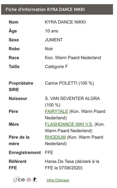 Pilna energii, wspaniała klacz reprodukcyjna KWPN czarna, sterylizowana, mająca 10 lat, zdrowa, mierząca 1,72 m, na bieżąco z wszystkimi szczepieniami i badaniami. Łagodna, łatwa w obsłudze, jeszcze nie kryła, ale łatwo reaguje na ruję. Zlokalizowana w Awinionie.