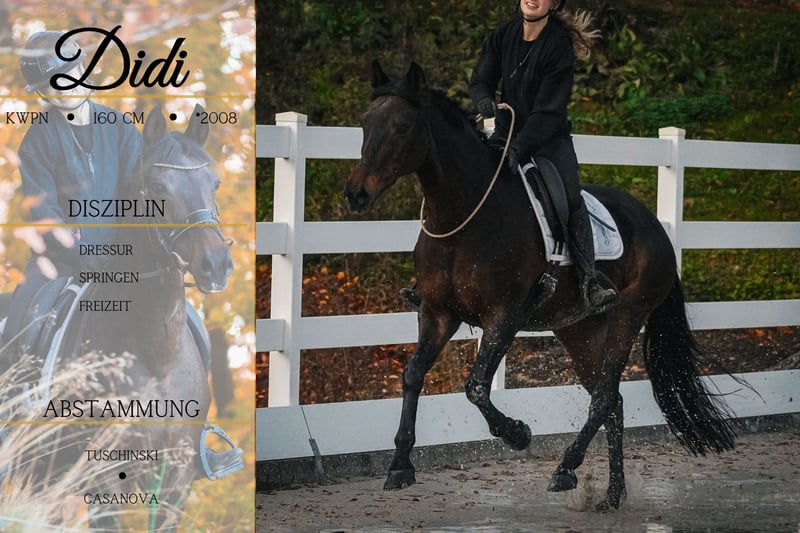 Didi to klacz urodzona w 2008 roku, o wzroście 160 cm, po Tuschinski, Krack C, Pion x Casanovo, Rinaldo. Idealny koń szkoleniowy, który zapewni komfort i radość z jazdy od pierwszych kroków. Bardzo dobrze wytrenowana, delikatna na pomoce, ale nie nadwrażliwa. Doskonała dla początkujących, nowicjuszy lub jako koń do nauki jazdy dla dzieci. Niezależnie od tego, czy chodzi o ujeżdżenie, pierwsze starty na konkursach, czy relaks na terenie, jest idealnym partnerem. Na zawodach zawsze wysoko plasowała się w klasyfikacji, także wśród młodzieży. Absolutnie odważna i spokojna, zawsze chętna do zabawy. Wykorzystaliśmy ją już nawet do jazdy w terenie z ogłowiem na halsingu, gdzie pokazała się jako bardzo opanowana i odważna. W obsłudze również bardzo łatwa. Aktualne nagranie znajduje się na naszym Instagramie – Pferdehandlung Dederichs. Badanie AKU wykonano w listopadzie 2025 roku. Nie przegap tej wyjątkowej oferty! Pferdehandlung Dederichs – Twój partner w zakupie konia Kontakt i dostępność: Prosimy o zapytania wyłącznie telefonicznie pod numer 0173/9792139 Poniedziałek – piątek: 09:00 – 18:00 Sobota: 09:00 – 15:00 Niedziela: dzień wolny Śledź nas na mediach społecznościowych! Zobacz naszą codzienność z końmi na Instagramie, TikToku i Facebooku pod nazwą Pferdehandlung Dederichs Rabat: Przy natychmiastowym odbiorze nowego wymarzonego konia otrzymujesz rabat od 5% do 10% Próba jazdy i prezentacja: • Próba jazdy: 30 € za konia (max. 2 jeźdźców), kwota zostanie odliczona od ceny zakupu • Święta: jazda próbna 50 € • Prezentacja przez naszych jeźdźców: 25 € za konia (przedjazd, praca na ziemi itp.) Badanie przedzakupowe i transport: • Wiele naszych koni ma już wykonane badanie AKU • Oczywiście możesz zabrać własnego weterynarza • Chętnie zorganizujemy badanie • Pomagamy również w transporcie do nowego domu Inne konie na sprzedaż: W naszym stajni dostępne są kolejne konie, które jeszcze nie są online. Jeśli Twoje wymarzone konie jeszcze nie ma w ofercie, nie wahaj się z nami skontaktować. Ważne informacje: • Wzrost koni jest szacunkowy i nie został dokładnie zmierzony • Wszystkie opisy są subiektywną oceną sprzedającego i nie stanowią gwarancji cech Więcej informacji znajdziesz na stronie: www.Pferdehandlung-Dederichs.de