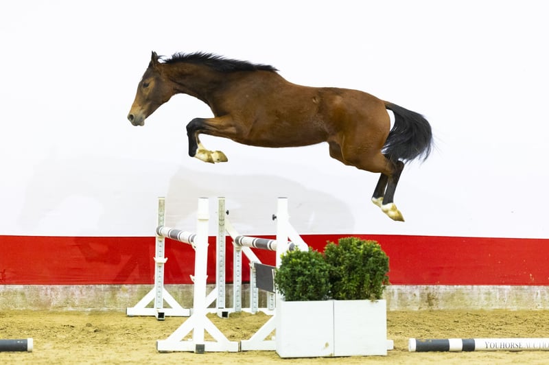 A horse with tremendous scope who already jumps with excellent style. She shows real power over the fence combined with very good technique. In her jumps you see balance, overview and natural reflex. She moves light-footed with a well-carried, powerful canter. Everything indicates quality and long-term potential. A modern sport horse with scope and technique.