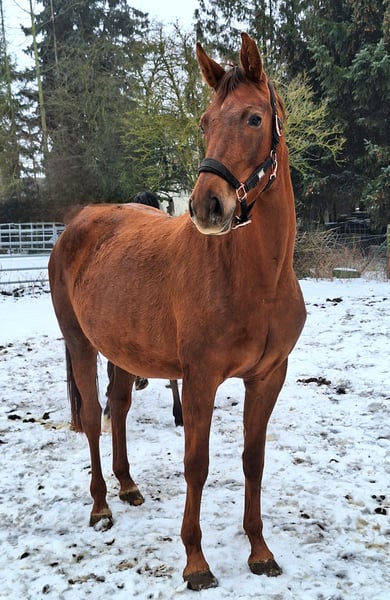 Verkaufe eine elegante KWPN-Stute, geboren im Jahr 2022. Diese wunderschöne Fuchsstute besticht durch ihre ansprechende Erscheinung und ihr vielversprechendes Zuchtpotenzial. Mit einem Stockmaß von 164 cm ist sie eine beeindruckende Erscheinung. Sie stammt aus einer renommierten Zucht und vereint Qualität, Charakter und Vielseitigkeit. Sie ist tragend vom Hengst Fair Deal (v. Franklin-Fürstenball) und muss in 04/2026 fohlen. Sie wird aus zeitlichen Gründen verkauft