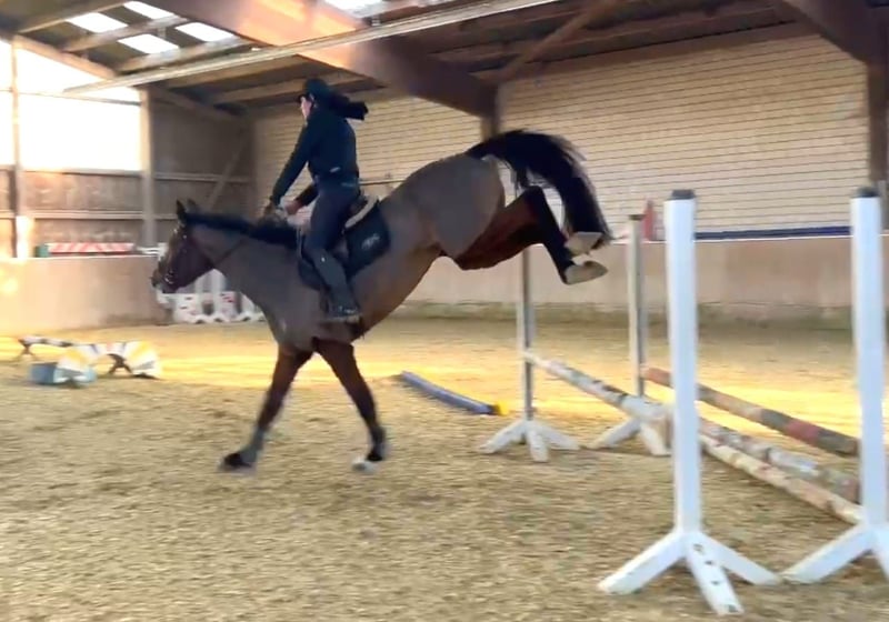 Very beautiful mare by Socrates vd Bosdam (Eras St. Hermelle) x Glennridge. From the same dam, there are already two successful jumping horses up to 1.50 m. Current height approximately 16.9 hh / 17.0 hh. She already jumps a small course and demonstrates a lot of talent. Also very pleasant to ride in dressage. Possesses three above-average gaits. A good veterinary certificate is available.