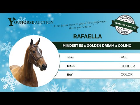 De vierjarige Rafaella is er eentje om in de gaten te houden, want een paard met zoveel kwaliteit gaat ongetwijfeld nog van zich laten horen. Ze spring met een krachtige afdruk, is snel van de grond, heeft precies de juiste dosis bloed en beschikt over zeer veel vermogen. Vader VDL Mindset ES, een zoon van de tophengst Aganix du Seigneur, ontwikkelt zich sterk in de sport. Recentelijk maakte hij een overtuigend debuut in de 4* 1.50m proeven met Hessel Hoekstra (NED). Zijn moeder Hosanne ES (v.Kannan) is ook internationaal 1.45m geklasseerd en bracht al meerdere internationale springpaarden. Moeder Mirage is een stermerrie van de 1.50m-hengst Gen, op diens beurt een nakomeling van Zirocco Blue VDL.