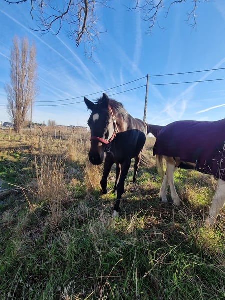 Elegante 3-4 jarige bruine merrie met 2 witte sokken vooraan. Sky is zadelmak, heeft mooie gangen en kan al goed afgebogen lopen. Sky is sociaal in de omgang en werkt graag.