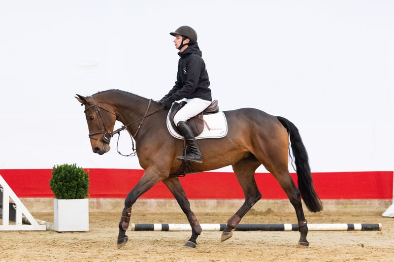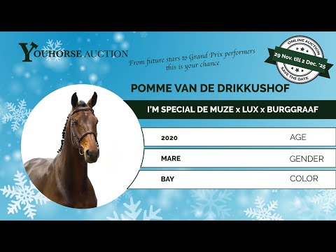 De vijfjarige Pomme van de Drikkushof heeft eerst een veulen gebracht en is nu klaar voor de oefenparcoursen. Ze toont bloed en heeft een fijne galop. Vader I’m Special de Muze, zelf 1.50m springen, is genetisch zeer sterk gefokt als zoon van de olympische springhengst Emerald van ’t Ruytershof uit topmerrie Walnut de Muze. Ook zijn nafok overtuigt, de eerste twintig nakomelingen zijn al doorgebroken op 1.55/1.60m niveau. Moeder Ulianda is een elitemerrie die zelf op 1.35m hoogte sprong. Ze is een dochter van de hengst Lux Z, een hengst die enorm gewaardeerd wordt in moederlijnen. Ulianda bracht al het 1.60m springpaard Kadar en twee 1.30-1.35m springpaarden. Grootmoeder Pawanda is een combinatie van Burggraaf x Nimmerdor en bracht drie 1.35m springpaarden en een 3* eventing paard.