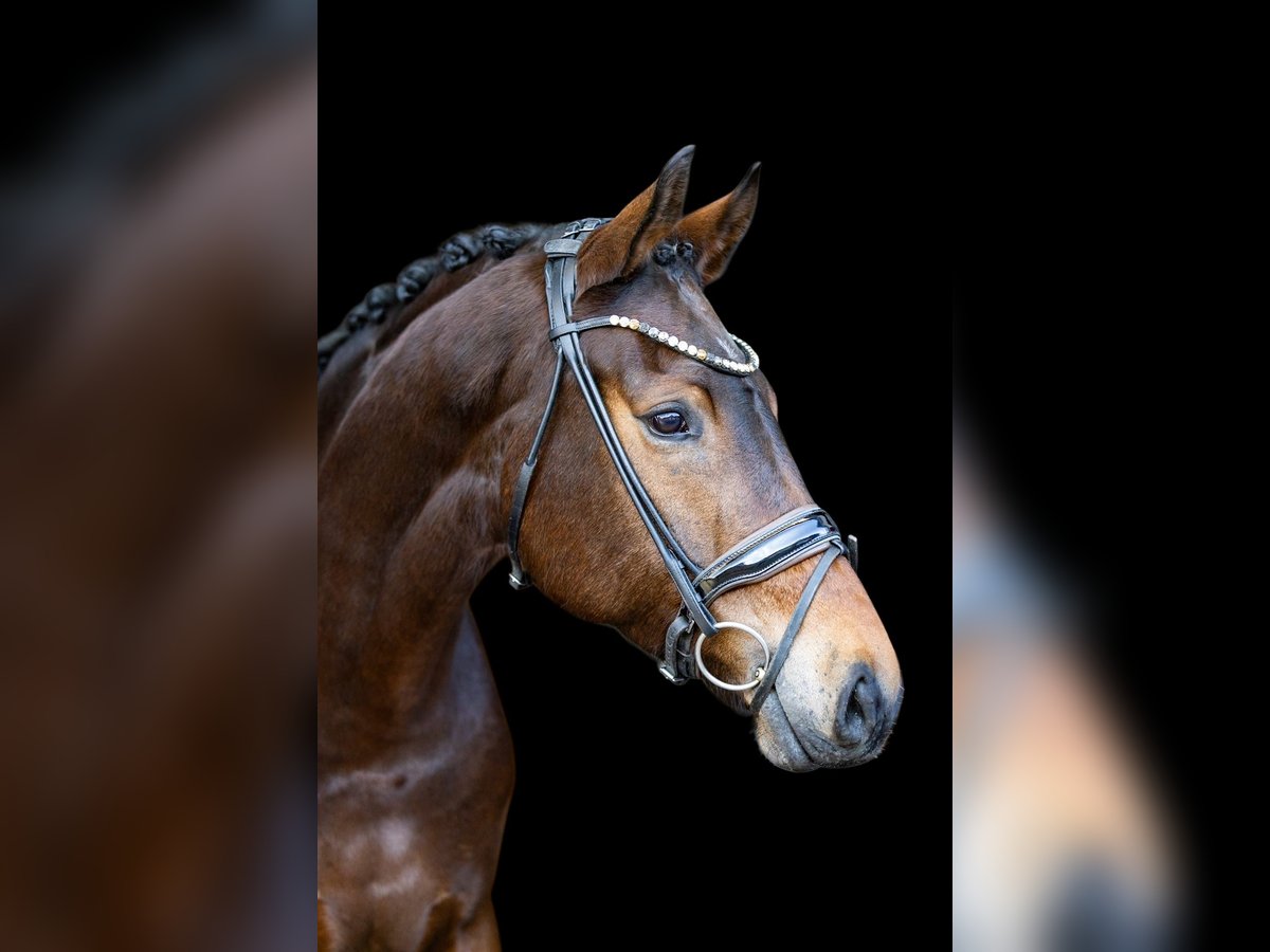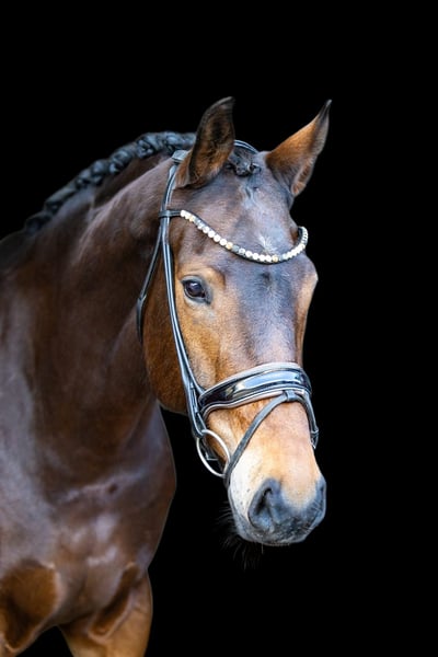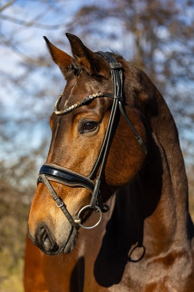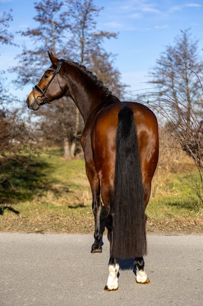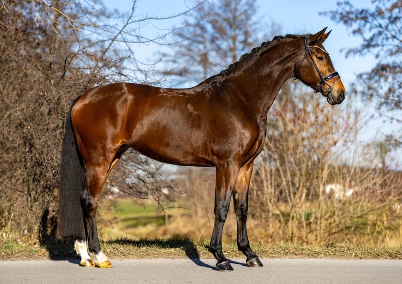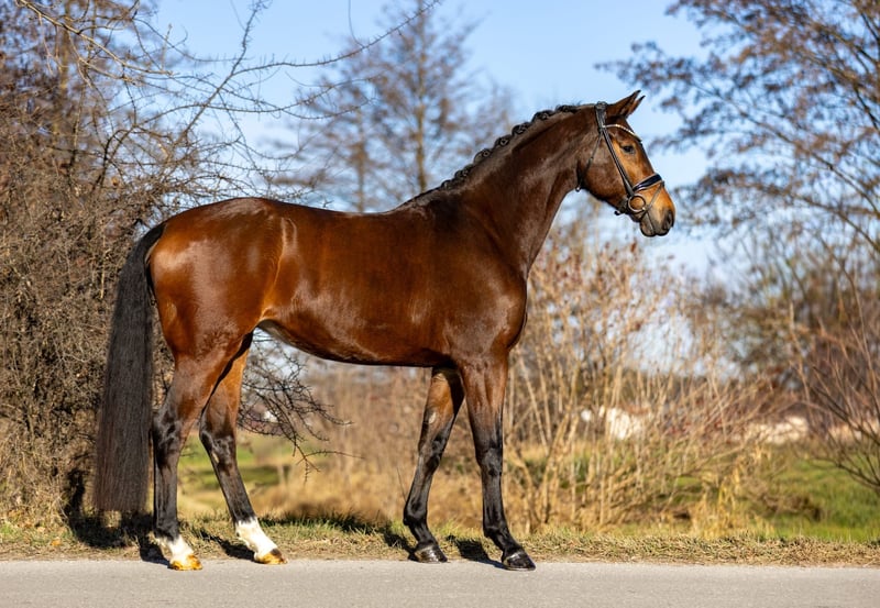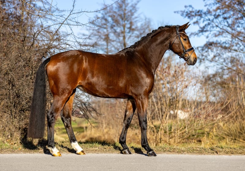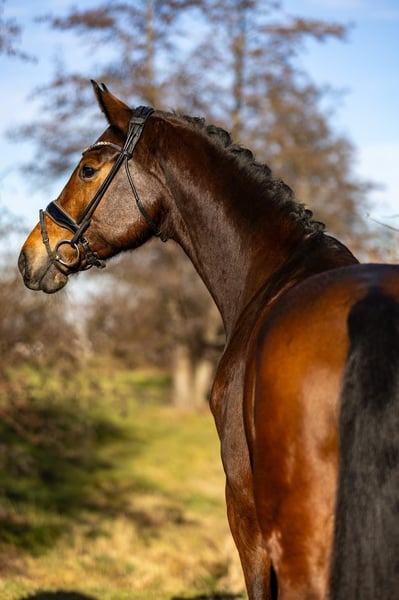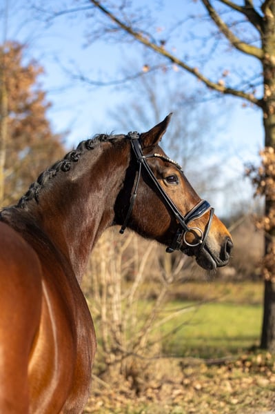 This very attractive bay mare impresses across the board with her composure, rideability, and quality. She has three very good basic gaits and consistently presents herself as forward-moving yet always controlled, honest, and focused. Under saddle, she is absolutely rideable, easy to sit, and always gives her rider a good feeling. She is not easily disturbed, remains clear-headed, and displays an exceptionally stable and reliable temperament. For this reason, she is also very suitable for less experienced riders or well-educated young riders. In handling as well as under saddle, she is very attentive, friendly, and trusting towards humans. It is clearly noticeable that she has been handled gently and has had no negative experiences so far. A horse that cooperates, builds trust, and shows joy in working together. With her modern, appealing exterior, excellent character, and high-quality movement, she is a desirable dressage horse that offers many opportunities—from ambitious amateurs to a solid competition partner. She is also interesting from a breeding perspective: she descends from Hotline and Vivaldi, providing a high-quality, proven dressage pedigree that makes her attractive for breeding purposes as well. A versatile, honest, and high-quality dressage horse that impresses with her character, quality, and reliability.
