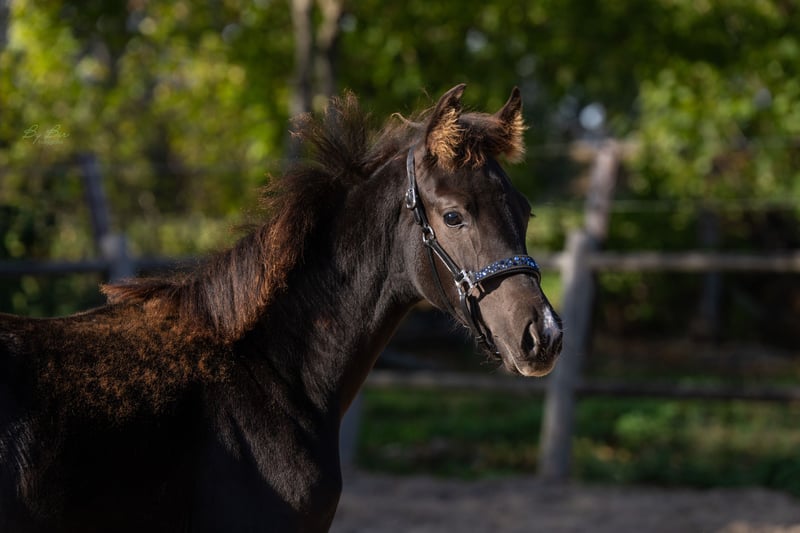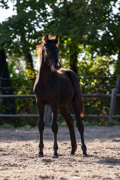 Sehr anhängliches und braves Stutfohlen. Läuft bereits an der Halfter. Kürzlich fachmännisch beschlagen, entwurmt und geimpft. Stammt aus einer guten deutschen Mutterlinie. Die Mutter ist prok and ster. Das Fohlen hat eine korrekte Körperhaltung und gute Beinstellung. Es verfügt über drei richtige Gänge und kann sich angenehm und elastisch bewegen. Auf jeden Fall ein Fohlen für die Zukunft. Das Fohlen hat bis zu sechs Monate bei der Mutter verbracht und steht jetzt in der Laufstallhaltung mit drei weiteren Stutfohlen. Es ist sofort verfügbar.