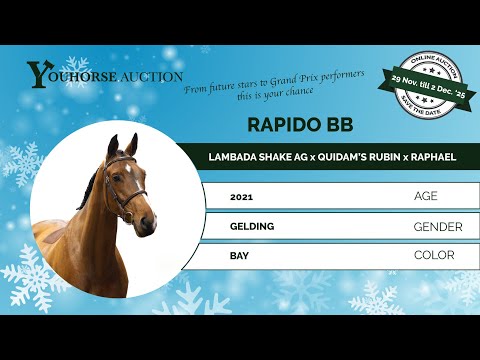 De vierjarige Rapido BB doet zijn naam alle eer aan, zo snel als hij van de grond komt. Hij heeft bloed, een grote galop en toont zich klaar voor de 1.00m parcoursen. Vader is de beloftevolle KWPN-hengst Lambada Shake AG Z (1.50m springen), die vorig jaar door Stal Hendrix verkocht werd aan Cian O’Connor. Moeder Minnie Mouse (v.Quidam’s Rubin) sprong 1.40m parcoursen. Grootmoeder Romina (v.Raphael) presteerde op 1.30m niveau en bracht ook Livius 132 (1.30m springen). Zelf was Romina een hafzus van Prestige (1.60m GP), Pandur (1.50m springen) en twee springpaarden op 1.40m niveau.