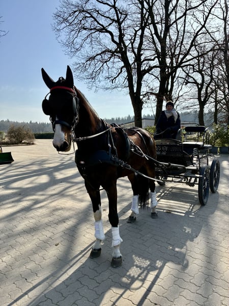 Rinaldo is a very well-behaved KWPN gelding, equipped with excellent basic gaits. He has a spacious walk and trot, and his canter in harness also demonstrates a high degree of collection. At just four years old, he has already competed in small events in single harness (dressage and cones). He has also been driven several times in pairs and was recently backed, which he handles very calmly. Please contact me for more videos and details via WhatsApp at +49 160 7841654.