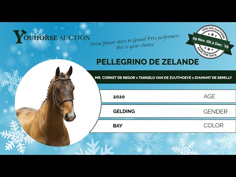 De vijfjarige Pellegrino de Zélande heeft al meerdere oefenparcoursen gelopen en laat daarin veel kwaliteit zien. Zijn krachtige afdruk, natuurlijke techniek en uitstekende instelling springen direct in het oog. Zijn vader Mr. Cornet de Regor is acht jaar en internationaal 1.45m gestart. Als zoon van Cornet Obolensky en de 1.55m Grand Prix-merrie Ohaj de Regor zijn de verwachtingen hooggespannen. Mr. Cornet de Regor is bovendien een kleinzoon van de waardevolle fokmerrie Centa de Muze. Aan moederszijde vinden we eveneens een sterke sportbasis. Moeder Flora de l’Impermeable (Tangelo van de Zuuthoeve) sprong zelf 1.60m-proeven en gaf al een internationaal 1.30m-paard. Grootmoeder Elvita de l’Impermeable voert de invloedrijke genen van Diamant de Semilly, Ahorn Z en Chin Chin.