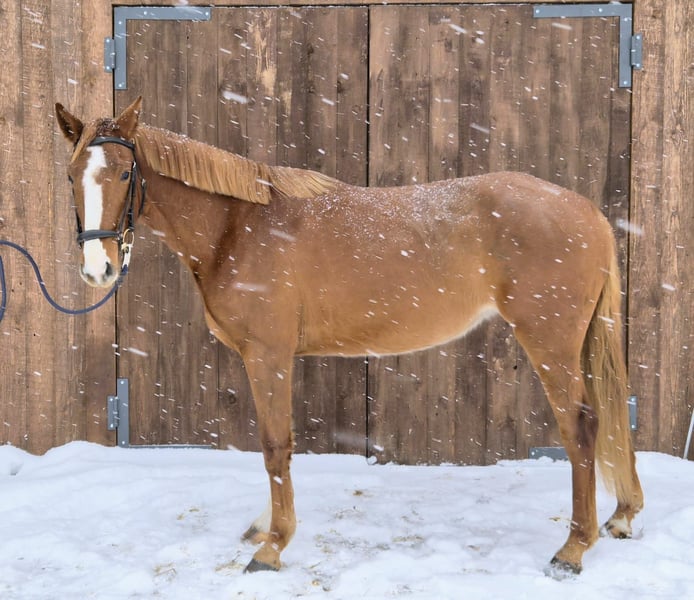 Elegant Latvian Warmblood mare, born in 2022, with a striking chestnut coat and a height of 165 cm. This well-bred young mare exhibits promising conformation and a balanced build, making her an excellent prospect for dressage. Her calm demeanor and natural athleticism suggest she will develop into a versatile and reliable partner for dressage. A rare opportunity to acquire a promising Latvian Warmblood mare with excellent potential for future training and competition.