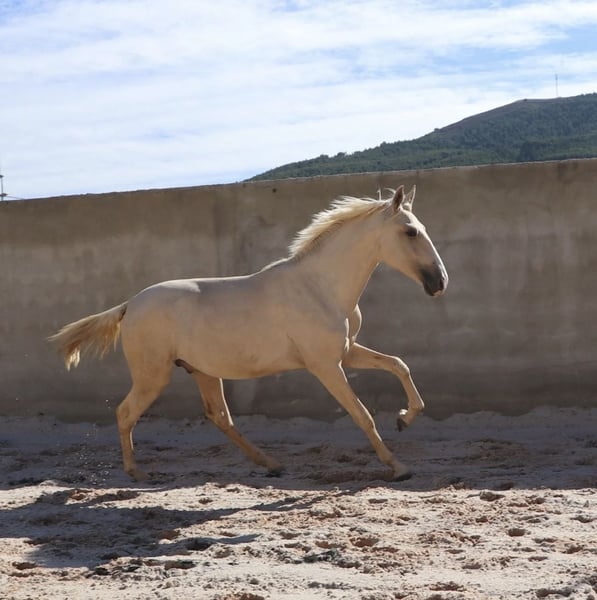 Caballo semental admirable con excelentes aires básicos - Raza: Lusitano - Sexo: Semental - Año de nacimiento: 2022 - Color: Palomino Dun, lo cual es muy raro - Altura: 166 cm, medida final estimada Ofrecemos a la venta un excepcional semental Lusitano nacido en 2022. Este magnífico Palomino no solo destaca por su impresionante apariencia en el color especial Palomino Dun, sino también por su potencial para la Working Equitation. Este joven semental ya muestra prometedoras cualidades para la Working Equitation. El talento para la Working Equitation le fue legado por su padre ADAGIO, quien tuvo éxito en campeonatos europeos y mundiales. Su carácter gentil y su disposición para aprender lo convierten en un compañero ideal para jinetes ambiciosos. Con su noble ascendencia y su cuerpo armónico, es un verdadero atractivo y también posee todas las condiciones para tener éxito en la cría. Puedo enviar más fotos y videos con gusto si hay interés.