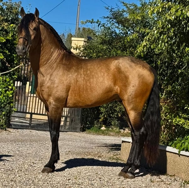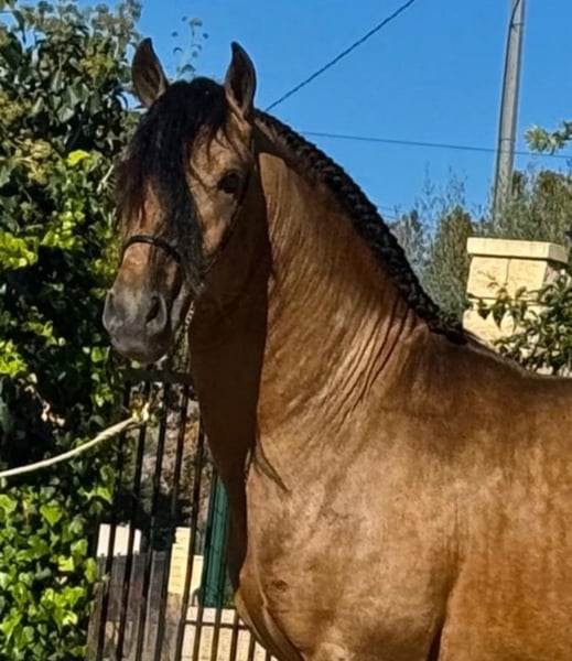 Im Kundenauftrag: Zuzu ist ein absoluter Blickfang: der imposante Hengst in Sonderfarbe ist mit einem barocken Gebäude, viel Hals und einem feinen Köpfchen ausgestattet. Zudem ist er sehr gut geritten und beherrscht die Traversale, Wechsel, Piroutte und beginnt mit der Piaffe. Unter dem Sattel zeigt er sich extrem rittig und leistungsbereit. Er ist unerschrocken und mit einen top Charakter ausgestattet. Sicherlich würde er sich gut im Viereck sowie aber auch in der Working Equitation oder im Showbereich machen. Zuzüglich kommt mit einem Equidenpass (ohne Pedigree), einer großen Ankaufsuntersuchung mit allen Röntgenbildern und ist piroplasmosefrei. Standort: Spanien - der Transport kann weltweit organisiert werden