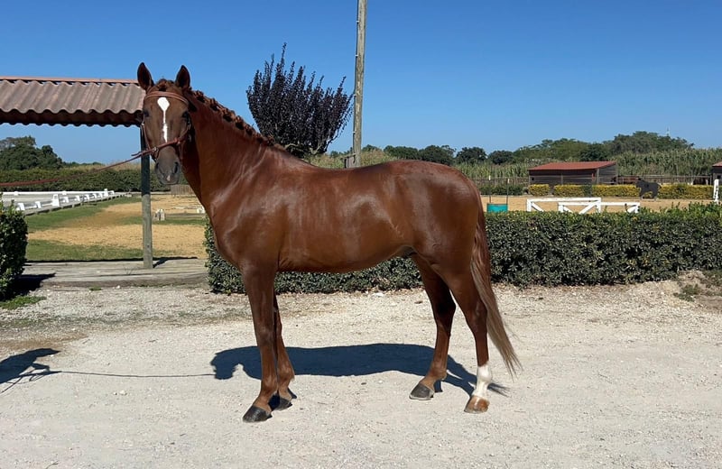 riem kastanje Lusitano Dit is een 5-jarige hengst van 158 cm die Working Equitation rijdt in zijn leeftijdscategorie. Hij is geschikt voor elke ruiter, ongeacht het niveau. Van een beginner tot een professional. Hij past zich direct aan zijn ruiter aan en is heel voorzichtig. Hij kan vliegende wissels doen, zijwaarts werken en de eerste stappen van de piaffe zetten. Zeer goed karakter, vriendelijk en ongecompliceerd, nergens bang voor en gaat overal mee naartoe. Gevestigd in Portugal Meer informatie via PM of WhatsApp +491786997334. Jasmin van Top-Lusitanos