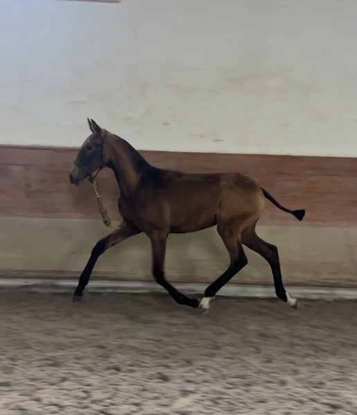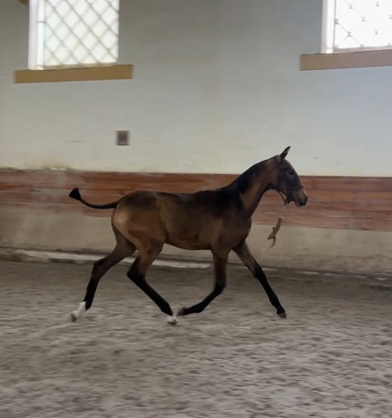 🌟 Lusitano Youngster with Top Genetics – "Viena" 🌟 - Breed: Lusitano - Sex: Mare - Year of Birth: 2025 - Color: Buckskin (without grey genes) - Estimated Height: 16.3 hh The young Lusitano mare Viena already impresses with her harmonious conformation, curiosity, and natural movement that simply makes riding enjoyable. She is a mare that you can easily envision under the saddle in dressage – modern, rideable, and with that certain something that stands out in sport. At the same time, her excellent pedigree makes her also interesting for breeding. 🧬 Excellent Lineage as a Guarantee of Quality Her sire, Hostil de Sena, is a performance-oriented stallion, licensed with over 70 points and standing at 1.66 m. He represents type, rideability, and athleticism. On the dam's side, she is out of none other than Escorial – one of the most renowned Lusitano sires worldwide, known for elasticity, presence, and an impressive progeny with international success. ➡️ With this pedigree, Viena has all the prerequisites to later reach over 1.60 m and excel in sport. 🐴 Character & Development Viena is growing up healthy within a herd, correctly conformed, very human-oriented, and shows a clever, pleasant personality. Her relaxed, well-timed basic gaits already hint at her sporting potential – especially for dressage and working equitation. 🎯 Future Prospects ✔ Talented riding horse for sport and leisure ✔ Valuable addition to breeding programs ✔ For ambitious individuals who appreciate quality 📩 Feel free to contact us for more information! Viena is waiting for someone who recognizes her talent and enjoys supporting her development along the way. ✨