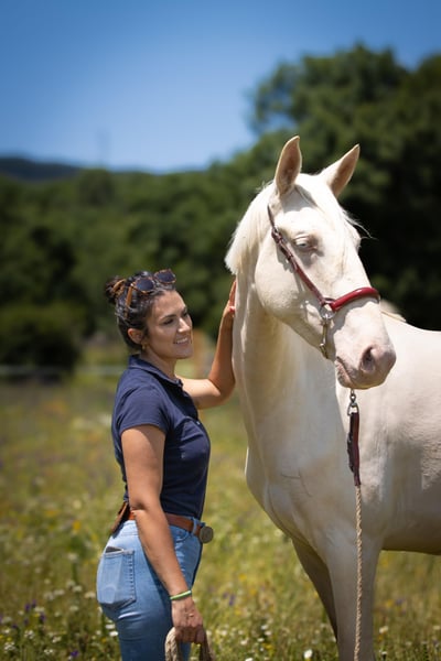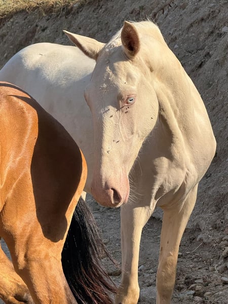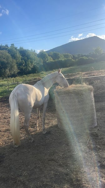 3 years old lusitano mare (not registered in APSL), in cremello colour, blue eyed. 161 in the withers currently. Working from the ground and also broken-in already.