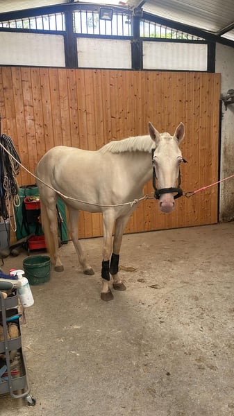 3-jarige lusitano merrie (niet geregistreerd bij APSL), in cremello kleur, met blauwe ogen. Momenteel 161 cm in de schoft. Werkt vanaf de grond en is ook al bereden.