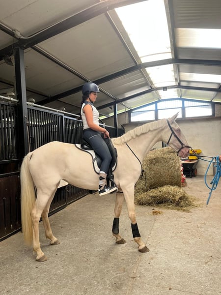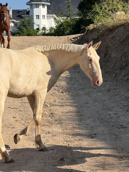 3-jährige Lusitano-Stute (nicht im APSL registriert), in cremello Farbe, mit blauen Augen. Aktuell 161 cm im Widerrist. Sie wird vom Boden aus gearbeitet und ist bereits angeritten.