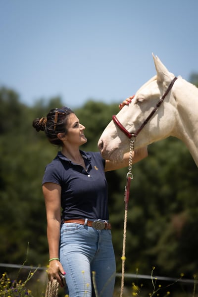 Yegua lusitana de 3 años (no registrada en APSL), de color cremello y ojos azules. Mide 161 cm a la cruz actualmente. Trabajada desde el suelo y ya montada.