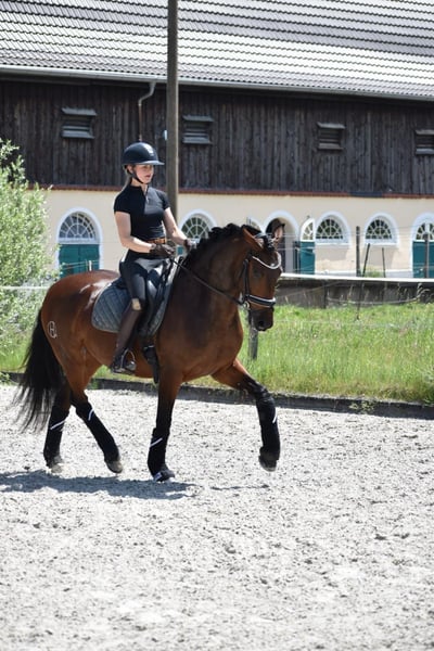 Rosa da Hermida est une jument lusitanienne sortie tout droit d'un conte de fées. Magnifique, pétillante - ronde comme un ballon, elle offre déjà à son cavalier, à seulement 4 ans, une sensation d'équitation fantastique. Grâce à son célèbre grand-père « Rubi », elle est certainement dotée de trois excellentes allures de base, faisant battre le cœur de chaque cavalier. Elle est très agréable à monter et légère dans la main. Elle a été délicatement débourrée et est actuellement en cours de formation polyvalente avec beaucoup de sensibilité. Sur le plan du caractère, cette jument est inégalable et est un véritable trésor à manipuler. Il n'y a aucune difficulté dans le quotidien - promenade au pré avec différents compagnons, douche, maréchal-ferrant, transport en van, attache, sorties en extérieur - pour Rosa, tout cela est une évidence. Un cheval de rêve qui est proposé à la vente uniquement en raison de sa petite taille. - Sans Piro.