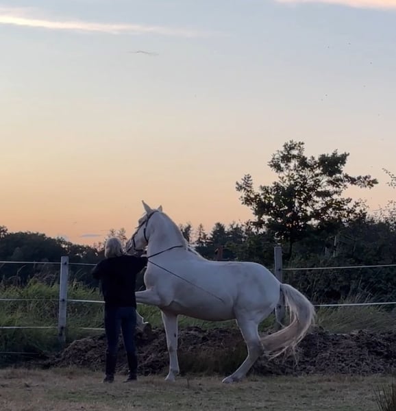 Reliable, relaxed Lusitano seeks a new sphere of activity. Aramis is trained in all basic gaits and masters all lateral movements as well as backing up. Short strides, canter on the outside, and Spanish walk started from the ground. First elevations on the hindquarters. He is loading-friendly, farrier-friendly, and well-mannered in handling. Not suitable for beginners and children. Better for ambitious leisure riders, advanced riders, academics, dressage riders, equestrian art, show riders, working equitation, or jumping. The horse wants to work and be developed, but remains calm, reliable, and relaxed in its work and does not bolt. He is also rather relaxed and calm in handling. A sensitive, willing to learn, attentive Lusitano. His character is honest, proud, reserved, majestic, and good-natured. This horse has not had any bad experiences in its life but can still react stallion-like and distrustfully. Typical Lusitano character.