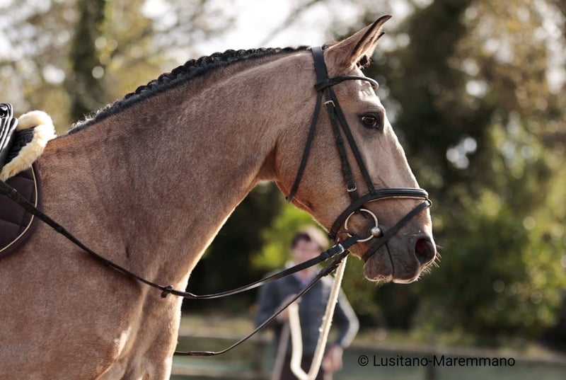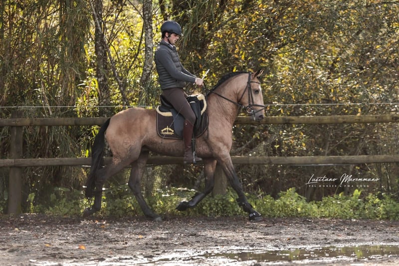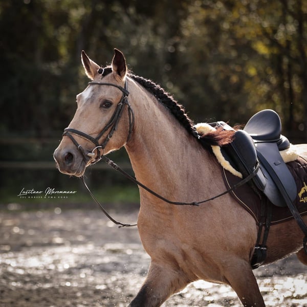 Beautiful PSL gelding in golden buckskin color Features: - Breed: Lusitano - Gender: Gelding - Year of Birth: 2020 - Color: Buckskin - Height: currently 152 cm, will grow a few more centimeters QUIXOTE is a young purebred Lusitano gelding (PSL) who impresses not only with his extraordinary color but also with his honest character and solid foundation. • Age / Height: currently about 1.52 m, final height approximately 1.54–1.55 m • Color: Buckskin – shimmering gold, very striking and noble • Pedigree: o Sire: URANIO (from SOCIEDADE DAS SILVEIRAS) o Dam: JERUPIGA, awarded 70 points • Health: up-to-date vet check without any issues • Training: Basic riding – confidently performs all three basic gaits, always well-behaved, uncomplicated, and with a good work ethic • Character: freshly started, very well-mannered in handling, people-oriented, and pleasantly uncomplicated. He remains calm, friendly, and eager to learn in every situation. QUIXOTE has everything one could wish for in a young Lusitano: excellent pedigree, best health, solid foundation under saddle, and a character that makes him a lifelong partner. His golden exterior completes the overall package. A horse with enormous potential – both for the leisure rider looking for a reliable companion and for riders seeking a special horse with prospects. I would be happy to provide more pictures and videos upon request.