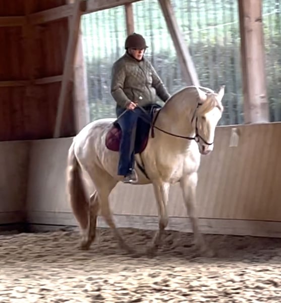 A 5-year-old Perlino with Dun coat seeking a new home. I am only offering him up because I cannot keep him with the mares due to his breeding activity. He has good basic gaits, including a very beautiful, large canter, and is easy to ride both indoors and in the field, making riding a real pleasure. Extremely affectionate and well-trained, he is an absolute dream horse. He has been solidly ridden but has not yet been extensively worked and needs further training.