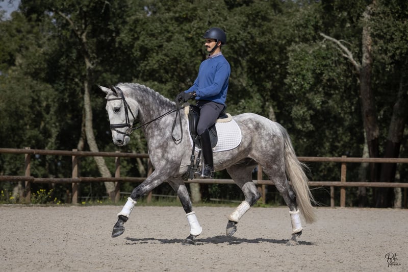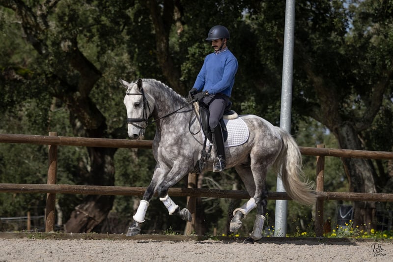 Qing RS (08/2020) 1,64 m piro-frei RX für den Sport zugelassen Qing ist ein talentierter, leichtfüßiger Lusitano-Wallach (PSL), Sohn des Grand Prix-Hengstes Jasmim Plus und mütterlicherseits verbunden mit Quadrado MAC (Coimbra). Er verfügt über drei überdurchschnittliche Gangarten: einen außergewöhnlich guten Schritt, einen leichten, schwebenden Trab mit schöner Schulterfreiheit und starkem Hinterbein sowie eine sehr ausgeglichene Galoppade. Aufgewachsen in Belgien. Gepflegt und gut erzogen. Ein sehr anhängliches und liebenswertes Pferd. Die letzten sechs Monate befindet er sich in professionellem Training in Portugal, wo er für den Verkauf vorbereitet wird. Ausbildungsstand: Seitwärtsarbeit, Kontragalopp, erste fliegende Wechsel. Er ist auch mit Bodenarbeit (TRT-Methode), Longieren und Handarbeit vertraut. Er kommt gut mit anderen Pferden aus. Im Umgang ist er sehr brav und gut erzogen. Qing gehört in eine höhere Preisklasse (>25.000 €) und ist in Portugal zu besichtigen.