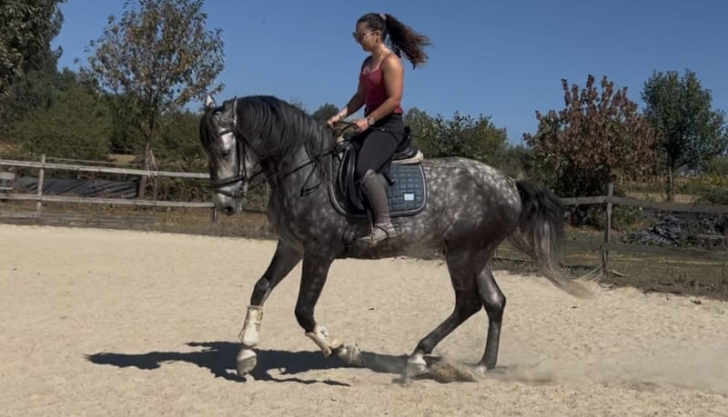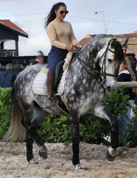 Wyjątkowo piękny, 6-letni szary klacz Lusitano o wysokości 1,62 m (około 16,1 hh) w kłębie, o łagodnym temperamencie i doskonałym wychowaniu. Jest łatwa w obsłudze we wszystkich aspektach codziennej opieki — szanująca, spokojna i niezawodna — co czyni ją prawdziwą przyjemnością do przebywania. Choć nie jest odpowiednia dla zupełnych początkujących, to koń, z którym amatorski jeździec, szczególnie z wsparciem trenera, może czerpać pełną satysfakcję i rozwijać się. Ten klacz jest w doskonałym stanie zdrowia, przebadana na piroplazmozę i posiada dostępne zdjęcia RTG. Jest w pełni zaszczepiona, odrobaczona, regularnie poddawana pielęgnacji zębów i kopyt, a także ma założone podkowy, co zapewnia gotowość do dalszego szkolenia i rozwoju bez przerw. Pod siodłem jest dobrze ugruntowana na wszystkich trzech chodach i obecnie uczy się zmian tempa, piruetów w kłusie oraz passage. Bez trudu wykonuje przejścia chodu stępnego w kłus, piruety w stępie, leg-yield, shoulder-in, travers, rein-back, półpasy i zmiany galopu. Z ziemi zaczyna pokazywać pierwsze kroki piaffe i hiszpańskiego kroku, wykazując zarówno chęć, jak i predyspozycje do pracy klasycznej. Wzięła już udział w pierwszych zawodach dressage na poziomie podstawowym, uzyskując niemal 68% — bardzo obiecujący wynik na debiut. Dzięki naturalnie zbalansowanemu i komfortowemu kłusowi, będzie również doskonałym kandydatem do pracy w ujeżdżeniu na poziomie rekreacyjnym, wykazując duży potencjał zarówno w fazach ujeżdżenia, jak i manewrowości. Na zewnątrz jest równie niezawodna. Ten koń jest odważny i pewny siebie podczas przejażdżek trailowych, nieustraszony wobec otoczenia, a szczególnie chętny do prowadzenia. Bardzo dobrze radzi sobie na samotnych wyjazdach i zachowuje spokój oraz stabilność przez cały czas. Znajduje się w Serra da Estrela w Portugalii i jest dostępna do odwiedzin oraz jazd próbnych bez żadnych problemów. Więcej filmów i dodatkowych zdjęć dostępnych na życzenie — zapraszamy do kontaktu w celu uzyskania więcej informacji. Cena do negocjacji dla odpowiedniego domu.