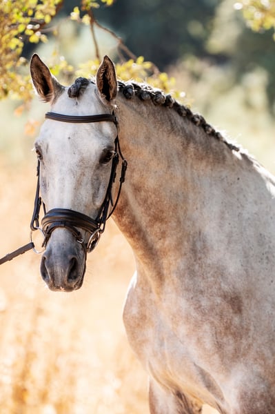 Wunderschöner, großrahmiger Lusitano-Wallach mit exquisiten Linien und großem Potenzial für die Dressur. Patuska ist La Donairas wertvollste Stammstute, sie vererbt zuverlässig feine Kopf- und Halslinien, elastische Bewegungen und einen tollen Charakter. Der LD-Hengst Iberio ist ein atemberaubend schöner Hengst mit außergewöhnlichen Bewegungen aus der Orphee RB-Linie (der erste Lusitano, der jemals an der Olympiade in Barcelona 1992 teilnahm). Oxygeno zeigt elastische Bewegungen, sein Trab ist aktiv mit guter Technik und er zeigt bereits erstaunliche Versammlungsfähigkeit in den Übergängen. Schöner Bergauf-Galopp und gute Arbeitsmoral - Ihr nächstes Dressurpferd!