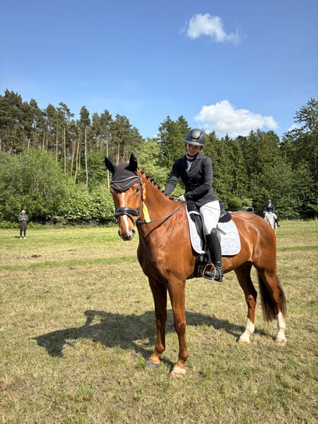 Zum Verkauf steht ein eleganter Mecklenburger Warmblut Wallach, geboren am 28.03.2019. Mein liebevoll genannter „Benno“ besticht durch seinen großen Rahmen und seine ansprechende Erscheinung. Er wurde bislang vorwiegend in der Dressur gearbeitet und machte dort immer wieder einen vielversprechenden Eindruck. Benno ist freundlich und brav im Umgang, braucht allerdings seine Routinen und eine ruhige und konsequente Führung, dann lässt er sich zu allem überreden. :) Wenn er diese gefunden hat, ließ er sich auch von Kindern und Reitanfängern lieb „reiten.“ Er besticht durch drei solide Grundgangarten und ist mit viel Schwung ausgestattet. Auch im Parcours hat er im Training bereits kleine Einblicke sammeln können und zeigte sich dort stets ehrlich und motiviert. Bislang ist er im Springen auf E/A Niveau. Ich wünsche mir für Benno ein zu Hause, in welchem sein braves Gemüt geschätzt wird und er weiter gefördert und ausgebildet wird. Im Freispringen ist er ein wahrer Selbstläufer und hat viel Freude daran. Ich könnte mir vorstellen, dass er zu einem guten Allrounder für einen ambitionierten Freizeitreiter werden kann. Er trug mich verlässlich durch mein Reitabzeichen. In Begleitung geht er auch sehr gerne und verlässlich ins Gelände und macht dort viel Freude. Benno ist unkompliziert zu verladen und natürlich Schmiedefromm. Er wurde regelmäßig dem Schmied vorgestellt, wird entwurmt und geimpft, sowie der Osteopathie vorgestellt. Er trägt vorne zwei Eisen und läuft hinten barhuf. Die Zähne werden demnächst nochmal routinemäßig gemacht. Benno hat noch nicht viel Turnierluft geschnuppert, zeigte sich dort aber jungpferdegerecht und stets händelbar. Dennoch war er zu Lehrgängen und Trainingseinheiten auf vielen anderen Plätzen/Hallen bereits unterwegs und konnte dort einige Eindrücke gewinnen. Bei Interesse oder für weitere Informationen stehe ich gerne zur Verfügung. Besichtigung und Proberitte sind nach Absprache möglich. Eine AKU aus 09/2023 liegt vor und kann gerne eingesehen werden. Benno und Ich freuen uns auf Ihre Anfragen :D Einiges an Zubehör darf gerne auch übernommen werden :)