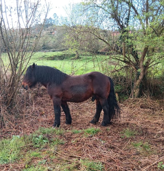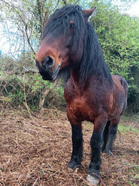 Burguete ist eine spanische Rasse aus Navarra, sehr robust und ursprünglich als Arbeitstier gezüchtet. Er hat mehrere Fohlen in die Welt gebracht, hat einen gutmütigen Charakter ohne Hengstgehabe, lässt sich gut handhaben, führen und auch reiten. Er ist 8 Jahre alt, lebt in Weidehaltung, kommt wenn man ihn ruft und freut sich über Zuwendung und Leckerlis