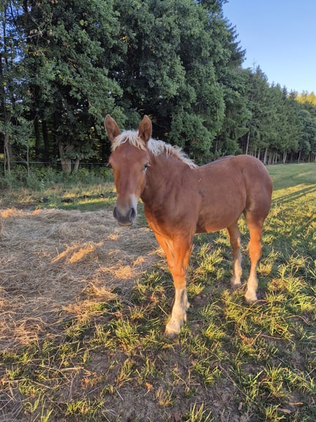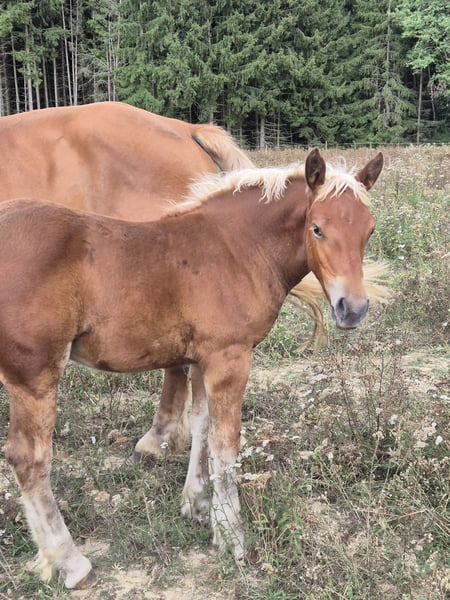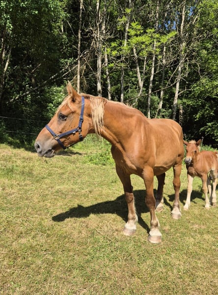 Trait Comtois Mare with Filly at Foot – with Pedigree For sale is the 11-year-old Trait Comtois mare Etoile du Ruchard. She is a registered breeding mare and has complete pedigree papers. Etoile du Ruchard is currently with a filly at foot. The filly was born in June 2025, is currently 3 months old, and has full pedigree. A covering certificate is available for the filly. The foal is healthy and developing very well for its age!!! The mare was used by the previous owner both as a driving horse and as a riding horse. She is strong, breed-typical, and offers a solid foundation for breeding, leisure, or work in harness. Details at a glance: Breed: Trait Comtois Mare, 11 years, Name: Etoile du Ruchard Height: 168 cm Registered breeding mare with pedigree Filly at foot, born 06/2025, with full pedigree and covering certificate Previous use: Driving & Riding Currently on rest due to the foal!!! This means the mare is not being worked at the moment!!! Image 4: Pedigree of the mare Image 5: Pedigree of the foal Viewing possible at any time by appointment. Further information available upon request.