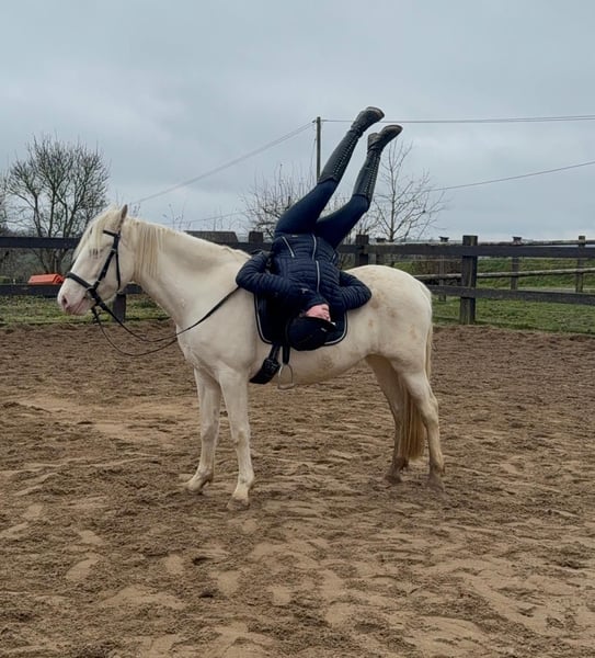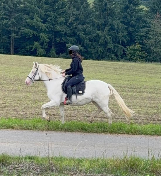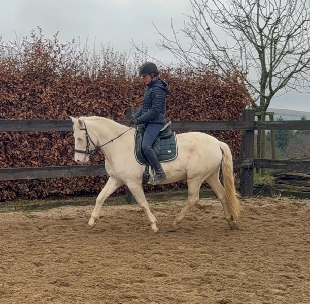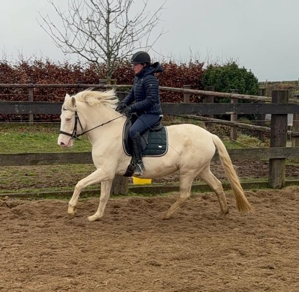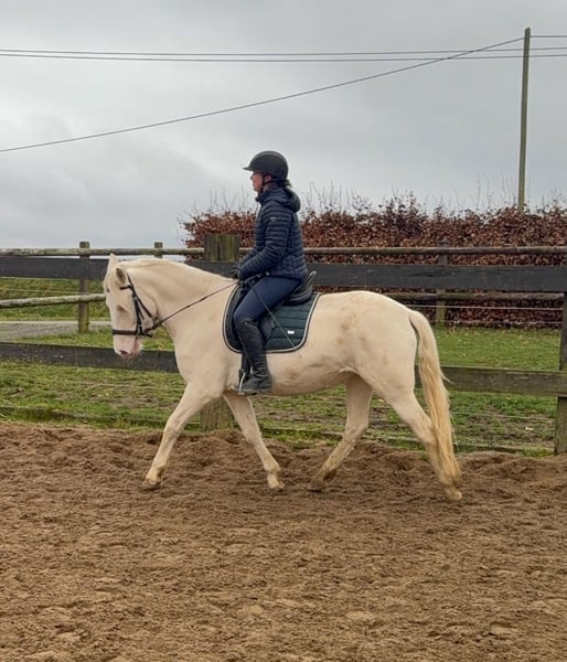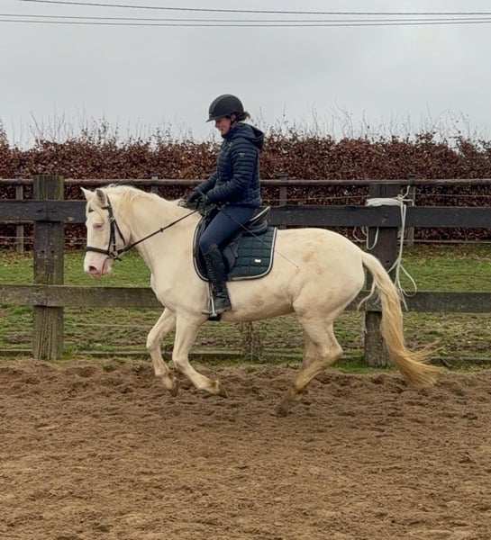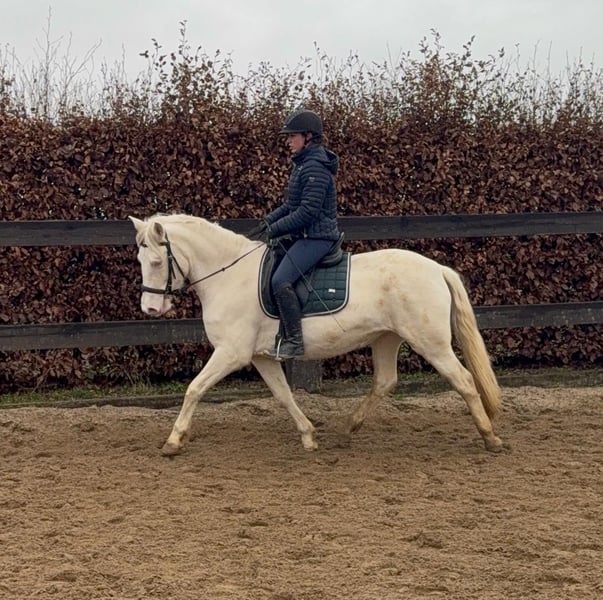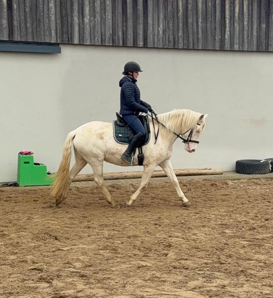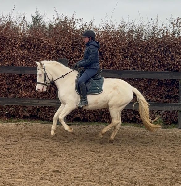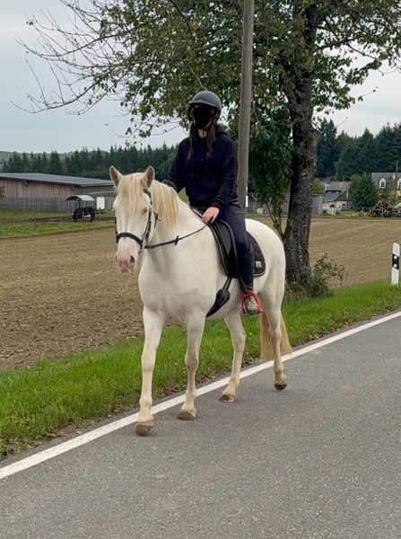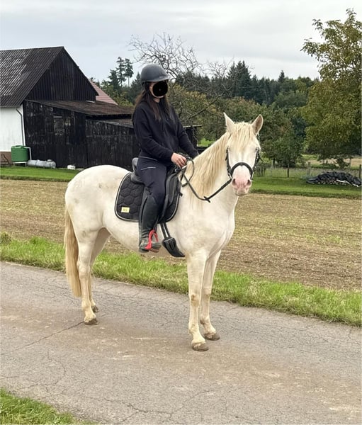 Zum Verkauf steht eine 5 Jahre alte, etwa 152cm große Cremello Stute mit gutem Gebäude und schöner Bewegung. Sie hat einen Pass ohne Abstammung und wird freizeit- dressurmäßig geritten. Bei der dressurmäßigen Arbeit zeigt sie sich talentiert, geht gut am Zügel und arbeitet gerne mit. Einen kleinen Sprung macht sie auch. Sie ist nicht schreckhaft, nicht aufgedreht und ein sehr gelassener ruhiger Typ. Unarten zeigt sie natürlich auch keine. Auch im Umgang ist sie einfach ein Traum und lässt sich alles brav gefallen. Sie wäre bestimmt ein tolles Familienpferd oder auch für eine Reitschule geeignet. Natürlich wäre sie auch ein Pferd für einen ambitionierteren Reiter. Die Hufe wurden frisch ausgeschnitte. Auch das geht ohne Probleme. Krankheiten oder Allergien sind nicht bekannt. Eine AKU darf gerne gemacht werden. Für das Probereiten, Vorreiten oder anderes Ausprobieren des Pferdes berechnen wir 35€. Beim Kauf wird dies gutgeschrieben. Gerne anrufen oder eine Nachricht senden 0157 36803742 Alle Angaben ohne Gewähr, Preisänderungen vorbehalten, Transport möglich, Onlinekauf möglich