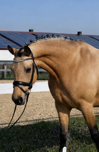Unsere hübsche Deutsche Reitpony Stute „Sonnenschein“ (9 Jahre, ca. 1,52 m Stockmaß) sucht ein neues, passendes Zuhause, in dem sie weiter gefördert und gefordert wird. Sonnenschein ist auf A-Niveau geritten und zeigt bereits erste Ansätze in Richtung L-Lektionen, wie zum Beispiel Außengalopp. Sie arbeitet motiviert mit und zeigt viel Freude an der Arbeit mit ihrem Menschen. Mit der richtigen Reiterhand macht sie viel Spaß und bietet eine schöne Grundlage, um sich gemeinsam weiterzuentwickeln. Im Gelände, in der Halle sowie auf dem Reitplatz zeigt sie sich grundsätzlich brav und zuverlässig. Dennoch ist Sonnenschein kein Anfängerpony. Sie benötigt einen ruhigen, erfahrenen Reiter, der ihr Sicherheit gibt und ihr den Weg klar vorgibt. Manchmal meint sie Dinge zu sehen, die für andere unsichtbar sind, wodurch sie gelegentlich einen kleinen Satz zur Seite machen kann – lässt sich aber sofort wieder gut kontrollieren. Charakterlich ist Sonnenschein eine brave, aber temperamentvolle Stute, die gerne arbeitet und ihrem Menschen viel Freude bereiten kann. Mit der passenden Bezugsperson entwickelt sie sich zu einer tollen Partnerin für Sport und Freizeit. Sie ist gesund, regelmäßig geimpft und entwurmt. Der Zahnarzt kommt regelmäßig, ebenso wird sie regelmäßig osteopathisch behandelt, sodass sie rundum gut betreut ist. Eine Besonderheit: Sonnenschein lässt sich die Hufe nur von einer weiblichen Hufschmiedin bearbeiten. Wir wünschen uns für sie ein liebevolles Zuhause bei einem erfahrenen Reiter, der ihr Sicherheit gibt und Freude daran hat, mit einem motivierten Pony zu arbeiten. Für Videos und weitere Fragen gerne telefonisch melden