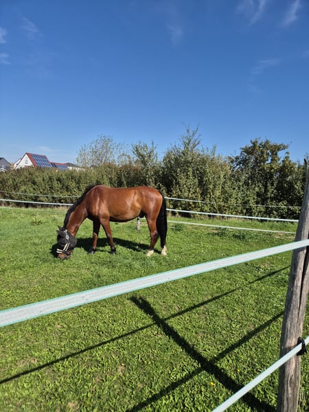 Ich verkaufe meinen 10- jährigen (Mai 2016) Wallach Rocketman. Er hat ein Stockmaß von ca. 1,55m, ist robust gebaut, sodass er auch größere Reiter gut abdeckt. Rocky ist ein sehr menschenbezogenes und verschmustes Pferd. Er steht bei uns in einer Box mit täglichem Paddock-/ Koppelgang, was mir für sein zukünftiges Zuhause auch sehr wichtig ist. Er ist sehr sozial mit anderen Pferden und spielt gerne. Im Umgang (putzen, satteln, trensen) ist er völlig unkompliziert. Da ich keine Turnierambitionen habe, wurde er die letzten 4 Jahre nur freizeitmäßig geritten. Bei den Vorbesitzern wurde er in Reiterwettbewerben vorgestellt. In der Dressur befindet er sich auf A- Niveau und bringt bei weiterer Förderung noch Potenzial mit. Ich habe öfters bei Lehrgängen für Stangenarbeit mitgemacht. Meine Reitbeteiligung ist ihn gesprungen, was ihm sehr viel Spaß macht. Er macht einen guten Sprung, braucht aber einen Reiter, der ihm Sicherheit gibt und ihm die richtigen Distanzen gut vermitteln kann. Er kennt es alleine und in der Gruppe ausreiten zu gehen. Mit wechselnden Reitern kommt er gut zurecht, er wird aber nicht an einen Schulbetrieb und auch nicht an Händler verkauft !! Er ist geeignet für Erwachsene und erfahrene Jugendliche, jedoch kein Anfängerpferd. Rocky wurde regelmäßig entwurmt und geimpft. Die Zähne wurden halbjährlich kontrolliert (ohne Handlungsbedarf) und er wurde regelmäßig osteopathisch/ physiotherapeutisch behandelt. Die Sättel wurden ebenfalls regelmäßig kontrolliert und angepasst. Er ist vorne beschlagen. Er ist im Sommer am Kopf beim Reiten empfindlich mit Fliegen, daher habe ich ihn draußen meist mit Nüsternnetz und Fliegenmaske geritten. Er ist absolut verladefromm und steht ruhig auf dem Hänger. Preis ist inkl. komplettem Zubehör, darunter ein Dressursattel von Stübben und ein Springsattel von Passier.